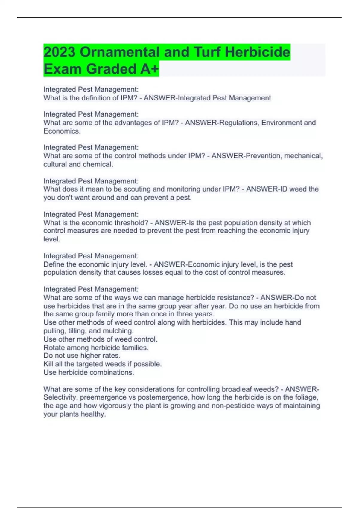 Integrated Pest Management: What is the definition of IPM? - ANSWER-Integrated Pest Management Integrated Pest Management: What are some of the advantages of IPM? - ANSWER-Regulations, Environment and Economics. Integrated Pest Management: What are some of the control methods under IPM? - ANSWER-Prevention, mechanical, cultural and chemical. Integrated Pest Management: What does it mean to be scouting and monitoring under IPM? - ANSWER-ID weed the you don't want around and can prevent a pest. Integrated Pest Management: What is the economic threshold? - ANSWER-Is the pest population density at which control measures are needed to prevent the pest from reaching the economic injury level. Integrated Pest Management: Define the economic injury level. - ANSWER-Economic injury level, is the pest population density that causes losses equal to the cost of control measures. Integrated Pest Management: What are some of the ways we can manage herbicide resistance? - ANSWER-Do not use herbicides that are in the same group year after year. Do no use an herbicide from the same group family more than once in three years. Use other methods of weed control along with herbicides. This may include hand pulling, tilling, and mulching. Use other methods of weed control. Rotate among herbicide families. Do not use higher rates. Kill all the targeted weeds if possible. Use herbicide combinations. What are some of the key considerations for controlling broadleaf weeds? - ANSWER-Selectivity, preemergence vs postemergence, how long the herbicide is on the foliage, the age and how vigorously the plant is growing and non-pesticide ways of maintaining your plants healthy.