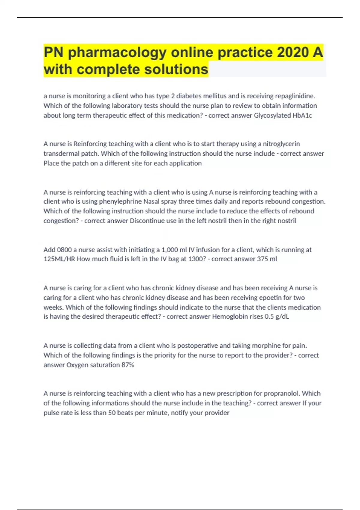 PN pharmacology online practice 2020 A with complete solutions