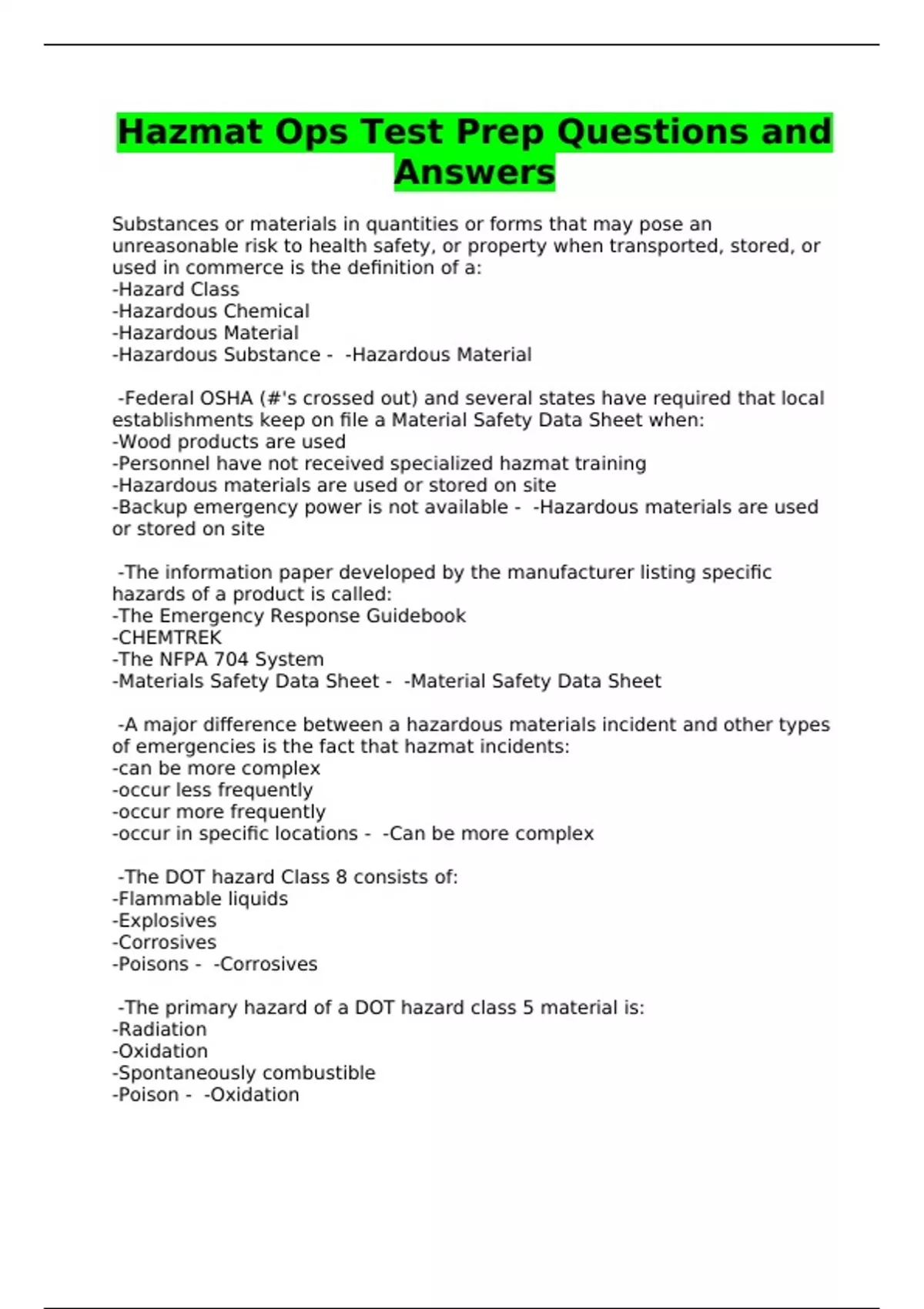Hazmat Ops Test Prep Questions and Answers