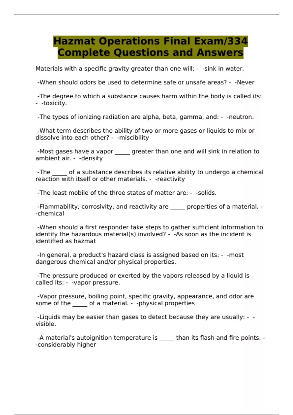 Hazmat Operations Final Exam/334 Complete Questions and Answers