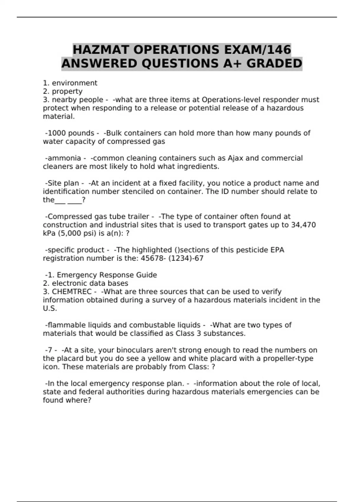 HAZMAT OPERATIONS EXAM/146 ANSWERED QUESTIONS A+ GRADED