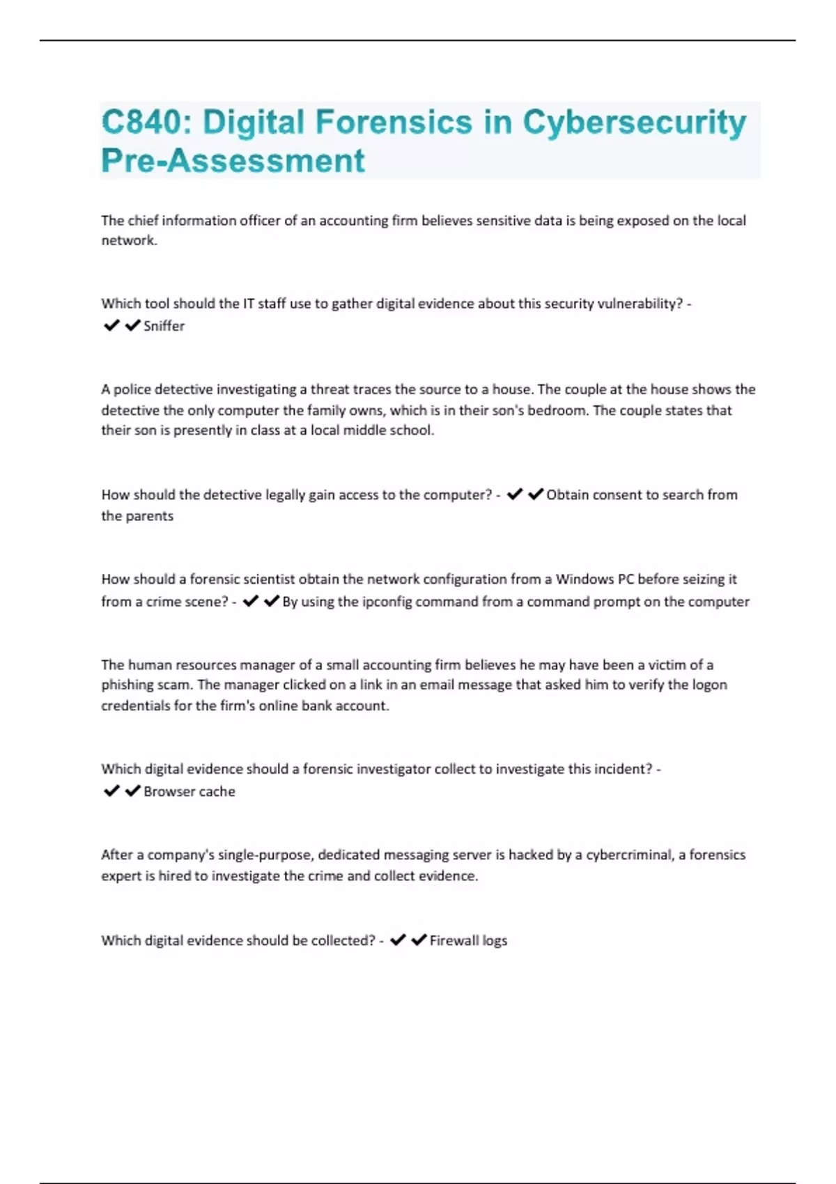 C840: Digital Forensics in Cybersecurity Pre-Assessment with well explained answers