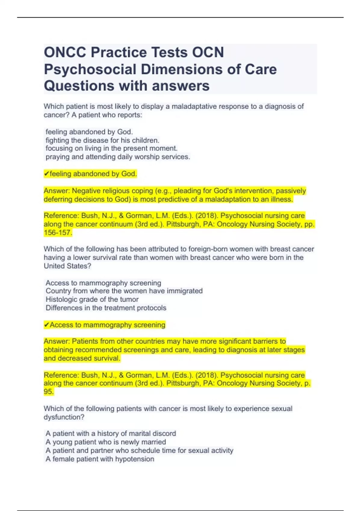 ONCC Practice Tests OCN Psychosocial Dimensions of Care Questions with answers