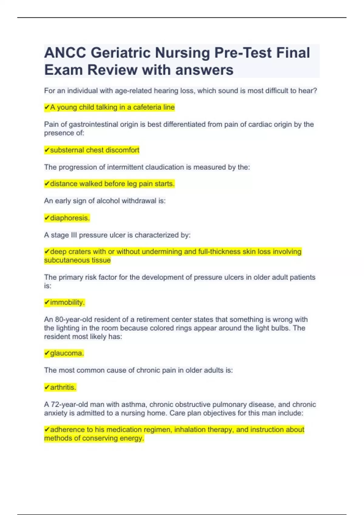 ANCC Geriatric Nursing Pre-Test Final Exam Review with answers