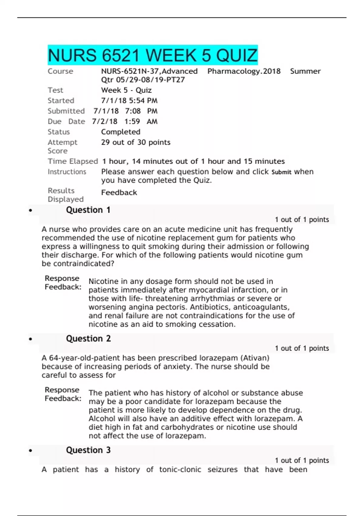 NURS 6521 WEEK 5 QUIZ Course NURS-6521N-37,Advanced Pharmacology.2018 Summer Qtr 05/29-08/19-PT27 Test Week 5 - Quiz Started 7/1/18 5:54 PM Submitted 7/1/18 7:08 PM Due Date 7/2/18 1:59 AM Status Completed Attempt Score 29 out of 30 points Time Elapsed 1 hour, 14 minutes out of 1 hour and 15 minutes Instructions Please answer each question below and click Submit when you have completed the Quiz. Results Displayed Feedback A nurse who provides care on an acute medicine unit has frequently recommended the use of nicotine replacement gum for patients who express a willingness to quit smoking during their admission or following their discharge. For which of the following patients would nicotine gum be contraindicated? Response Feedback: Nicotine in any dosage form should not be used in patients immediately after myocardial infarction, or in those with life- threatening arrhythmias or severe or worsening angina pectoris. Antibiotics, anticoagulants, and renal failure are not contraindications for the use of nicotine as an aid to smoking cessation. A 64-year-old-patient has been prescribed lorazepam (Ativan) because of increasing periods of anxiety. The nurse should be careful to assess for Response Feedback: The patient who has history of alcohol or substance abuse may be a poor candidate for lorazepam because the patient is more likely to develop dependence on the drug. Alcohol will also have an additive effect with lorazepam. A diet high in fat and carbohydrates or nicotine use should not affect the use of lorazepam. A patient has a history of tonic-clonic seizures that have been successfully treated with phenytoin (Dilantin) for several years. Phenytoin achieves a therapeutic effect by
