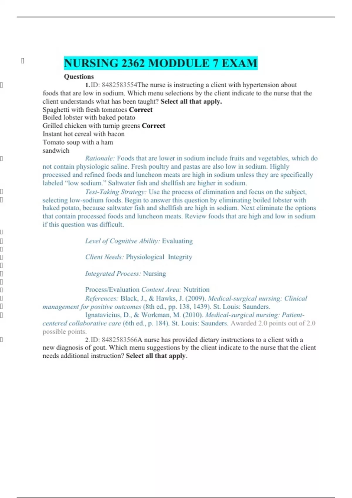 NURSING 2362 MODDULE 7 EXAM Questions 1. ID: 4The nurse is instructing a client with hypertension about foods that are low in sodium. Which menu selections by the client indicate to the nurse that the client understands what has been taught? Select all that apply. Spaghetti with fresh tomatoes Correct Boiled lobster with baked potato Grilled chicken with turnip greens Correct Instant hot cereal with bacon Tomato soup with a ham sandwich Rationale: Foods that are lower in sodium include fruits and vegetables, which do not contain physiologic saline. Fresh poultry and pastas are also low in sodium. Highly processed and refined foods and luncheon meats are high in sodium unless they are specifically labeled “low sodium.” Saltwater fish and shellfish are higher in sodium. Test-Taking Strategy: Use the process of elimination and focus on the subject, selecting low-sodium foods. Begin to answer this question by eliminating boiled lobster with baked potato, because saltwater fish and shellfish are high in sodium. Next eliminate the options that contain processed foods and luncheon meats. Review foods that are high and low in sodium if this question was difficult. Level of Cognitive Ability: Evaluating Client Needs: Physiological Integrity Integrated Process: Nursing Process/Evaluation Content Area: Nutrition References: Black, J., & Hawks, J. (2009). Medical-surgical nursing: Clinical management for positive outcomes (8th ed., pp. 138, 1439). St. Louis: Saunders. Ignatavicius, D., & Workman, M. (2010). Medical-surgical nursing: Patient- centered collaborative care (6th ed., p. 184). St. Louis: Saunders. Awarded 2.0 points out of 2.0 possible points. 2. ID: 6A nurse has provided dietary instructions to a client with a new diagnosis of gout. Which menu suggestions by the client indicate to the nurse that the client needs additional instruction? Select all that apply.