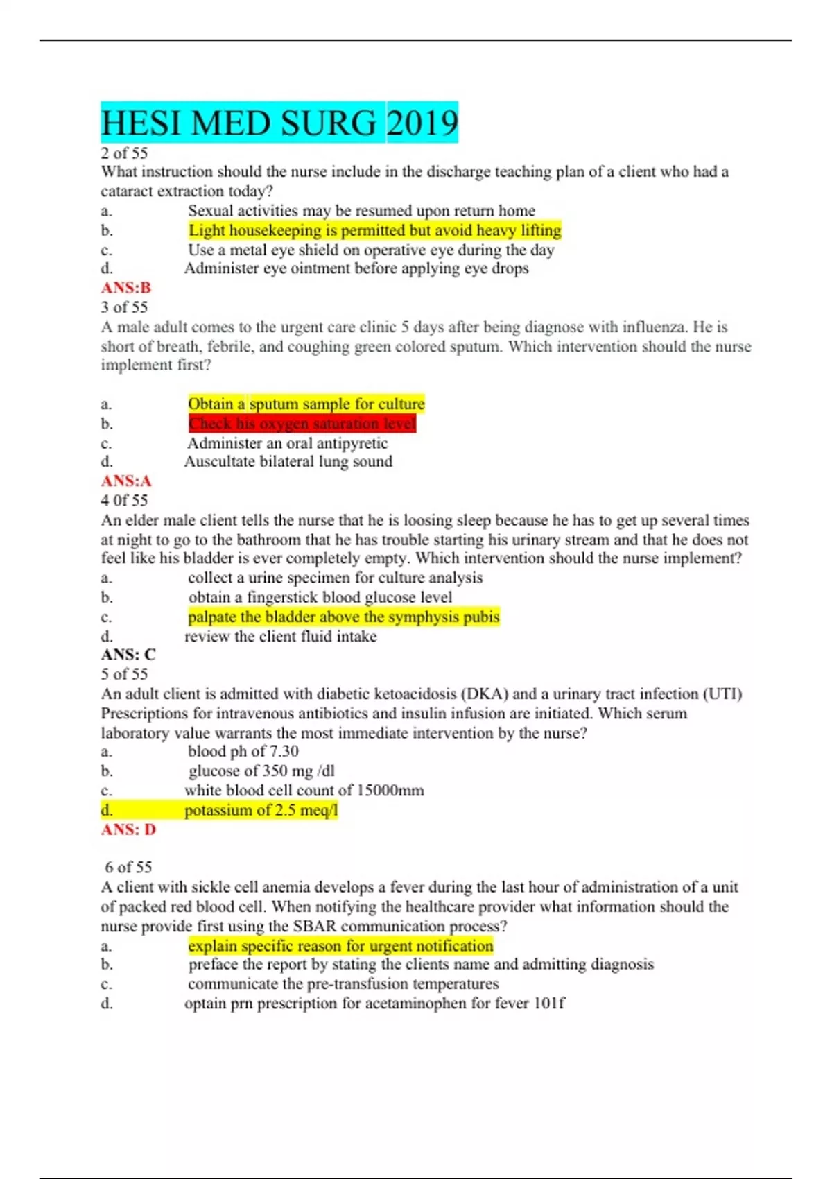 MED SURG 2019 2 of 55 What instruction should the nurse include in the discharge teaching plan of a client who had a cataract extraction today? a. Sexual activities may be resumed upon return home b. Light housekeeping is permitted but avoid heavy lifting c. Use a metal eye shield on operative eye during the day d. Administer eye ointment before applying eye drops ANS:B 3 of 55 A male adult comes to the urgent care clinic 5 days after being diagnose with influenza. He is short of breath, febrile, and coughing green colored sputum. Which intervention should the nurse implement first? a. Obtain a sputum sample for culture b. Check his oxygen saturation level c. Administer an oral antipyretic d. Auscultate bilateral lung sound ANS:A 4 0f 55 An elder male client tells the nurse that he is loosing sleep because he has to get up several times at night to go to the bathroom that he has trouble starting his urinary stream and that he does not feel like his bladder is ever completely empty. Which intervention should the nurse implement? a. collect a urine specimen for culture analysis b. obtain a fingerstick blood glucose level c. palpate the bladder above the symphysis pubis d. review the client fluid intake ANS: C 5 of 55 An adult client is admitted with diabetic ketoacidosis (DKA) and a urinary tract infection (UTI) Prescriptions for intravenous antibiotics and insulin infusion are initiated. Which serum laboratory value warrants the most immediate intervention by the nurse? a. blood ph of 7.30 b. glucose of 350 mg /dl