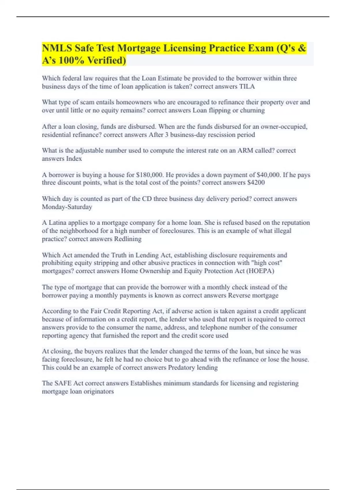 NMLS Safe Test Mortgage Licensing Practice Exam (Q's & A’s 100% Verified)