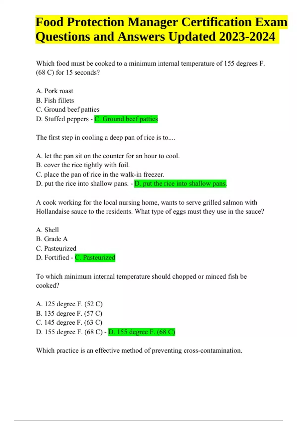 Food Protection Manager Certification Exam Questions and Answers Updated . Which food must be cooked to a minimum internal temperature of 155 degrees F. (68 C) for 15 seconds? A. Pork roast B. Fish fillets C. Ground beef patties D. Stuffed peppers - C. Ground beef patties The first step in cooling a deep pan of rice is to.... A. let the pan sit on the counter for an hour to cool. B. cover the rice tightly with foil. C. place the pan of rice in the walk-in freezer. D. put the rice into shallow pans. - D. put the rice into shallow pans. A cook working for the local nursing home, wants to serve grilled salmon with Hollandaise sauce to the residents. What type of eggs must they use in the sauce? A. Shell B. Grade A C. Pasteurized D. Fortified - C. Pasteurized To which minimum internal temperature should chopped or minced fish be cooked? A. 125 degree F. (52 C) B. 135 degree F. (57 C) C. 145 degree F. (63 C) D. 155 degree F. (68 C) - D. 155 degree F. (68 C) Which practice is an effective method of preventing cross-contamination. Food Protection Manager Certification Exam Questions and Answers Updated A. Cooking food items to the correct internal cooking temperature B. Keeping the kitchen floor and walls clean and sanitary at all times C. Exterminating pest that have entered the facility D. Cleaning and sanitizing cutting boards between prepping cooked and raw meat - D. Cleaning and sanitizing cutting boards between prepping cooked and raw meat A couple orders grilled top sirloin and grilled halibut. The customer tells the server that he is allergic to fish. The server tells the Chef. After placing the sirloin on the grill, the Chef places the halibut in a saute pan. After 10 minutes, the Chef uses the same pair of tongs to turn the halibut and then the steak. The Chef committed A. cross contact B. cross grilling C. cross connection D. cross allergen switching - A. cross contact A food handler is permitted to work with highly susceptible populations without prior approval from the local regulatory authority when the food handler has a A. diagnosis of norovirus. B. diagnosis of typhoid fever but provides a medical note. C. visibly covered wound. D. case of jaundice for more than 7 days. - C. visibly covered wound. Reusable containers provided by an operation for take-home food must be A. provided and maintained by the customer. B. cleaned and sanitized by the customer before being refilled. C. returned to the operation labeled with the customer's name. D. cleaned and sanitized by the operation before being refilled. - D. cleaned and sanitized by the operation before being refilled. The manager assigns a cook to monitor and record temperatures on the steam table in order to A. keep the food from drying out. B. prevent cross-contamination. C. avoid time-temperature abuse. D. ensure food quality. - C. avoid time-temperature abuse. In a self-service area, utensils should be provided for each item to prevent customers from A. taking more than one serving at a time. B. asking a server to dispense food. C. sampling the food. D. using their bare hands to dispense food. - D. using their bare hands to dispense food. Food displayed on a salad bar A. must be protected by food guards. B. should be placed on ice. C. should be maintained at 45 degrees F (7 C) D. must include nutritional information. - A. must be protected by food guards. The purpose of sneeze guards in self-service areas is to A. maintain food temperature. B. retain food surface moisture. C. protect food from customer contamination. D. keep insects out of food. - C. protect food from customer contamination. A consumer advisory is required when serving A. cooked-to-order hamburgers. B. stuffed shrimp. C. lamb chops. D. reheated beef stew. - B. stuffed shrimp. Food has been honestly presented if it A. has been farmed locally in organic soil B. has been grown without the use of pesticides. C. contains only the freshest ingredients. D. does not contain color additives. - D. does not contain color additives. An example of a corrective action is A. reusing utensils for each new task. B. serving food on a buffet that is below 165 degrees F (74 C) C. using the same equipment for raw food and ready-to-eat food. D. Reheating food on a buffet that is below 135 degrees F (57 C) - D. Reheating food on a buffet that is below 135 degrees F (57 C) When using a single tank dishwasher, the utensil surface temperature must reach at least A. 160 degrees F (71 C) B. 170 degrees F (77 C) C. 180 degrees F (82 C) D. 190 degrees F (88 C) - C. 180 degrees F (82 C) If chemicals are transferred to secondary containers, the secondary containers must be labeled with the chemical's A. expiration date. B. common name. C. usage instructions. D. SDS information. - B. common name. Using hard water when preparing a sanitizing solution will cause the sanitizer to be A. dangerous. B. more effective. C. less effective. D. useless. - C. less effective. Sanitizer concentration is measured using a test kit and expressed in A. parts per million (ppm). B. acidity or alkalinity (pH). C. drops per liter. D. milliliters per second. - A. parts per million (ppm). A pan is being washed in a three-compartment sink. Some food bits are stuck to the pan. To clean the pan correctly A. soak the pan in warm water, wash it in a detergent solution, rinse, and air-dry. B. scrape the pan, wash it in a detergent-sanitizer solution, rinse, and air-dry. C. scrape the pan wash it in a detergent solution, rinse, sanitize, and air dry. D. soak the pan in warm water, wash it in a detergent solution, immerse it in a chlorine bleach solution, rinse, and air dry. - C. scrape the pan wash it in a detergent solution, rinse, sanitize, and air dry. Which action should a food handler take if a sanitizing solution has weakened after 2 hours? A. Add boiling water. B. Add more sanitizer C. Increase the contact time. D. Replace the entire solution. - D. Replace the entire solution. Where can cleaning chemicals or other t