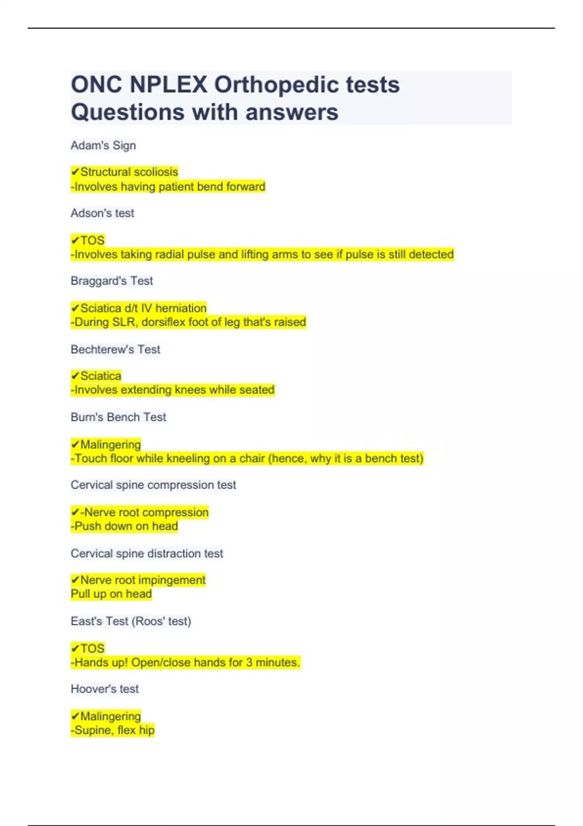 ONC NPLEX Orthopedic tests Questions with answers