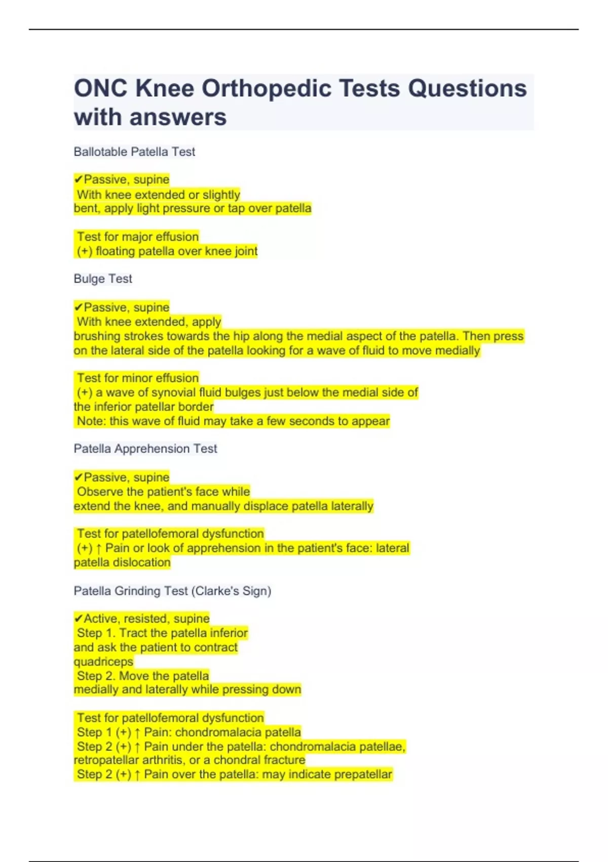 ONC Knee Orthopedic Tests Questions with answers