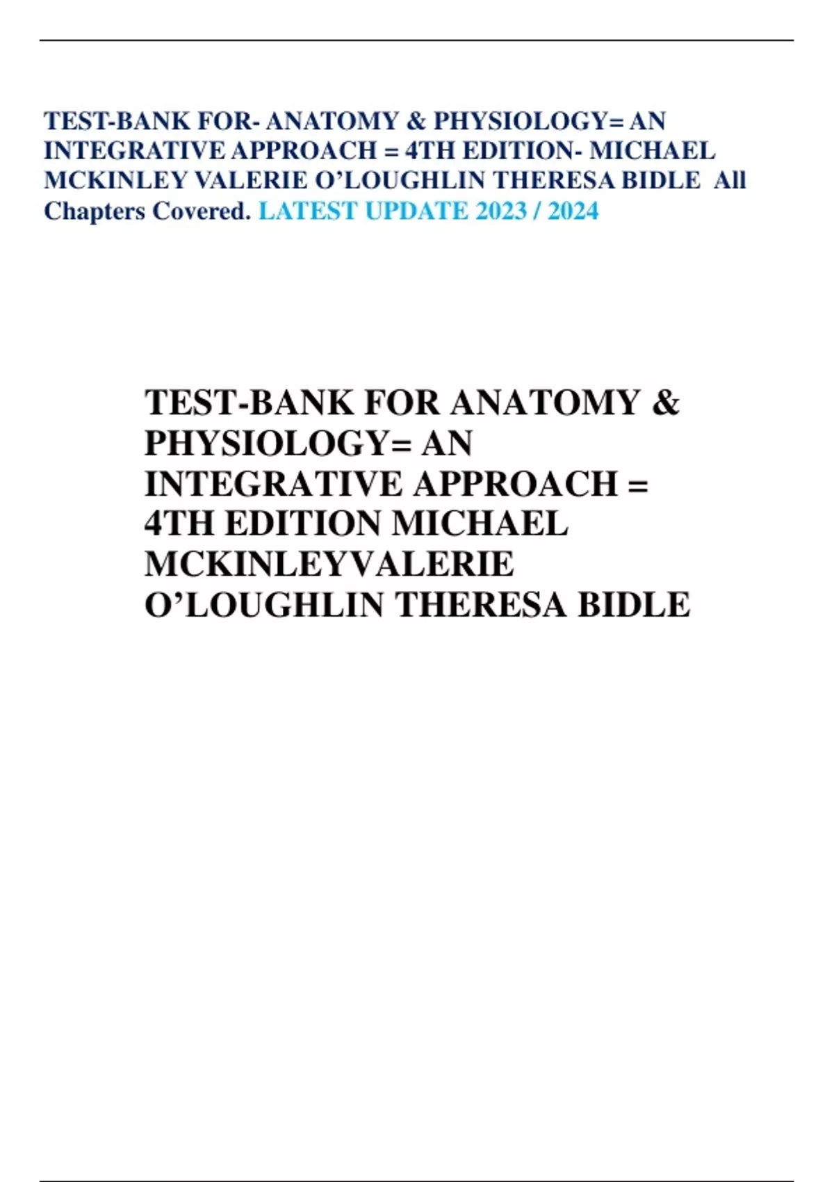 TEST-BANK FOR- ANATOMY & PHYSIOLOGY= AN INTEGRATIVE APPROACH = 4TH EDITION- MICHAEL MCKINLEY VALERIE O’LOUGHLIN THERESA BIDLE All Chapters Covered. LATEST UPDATE 2023 / 2024