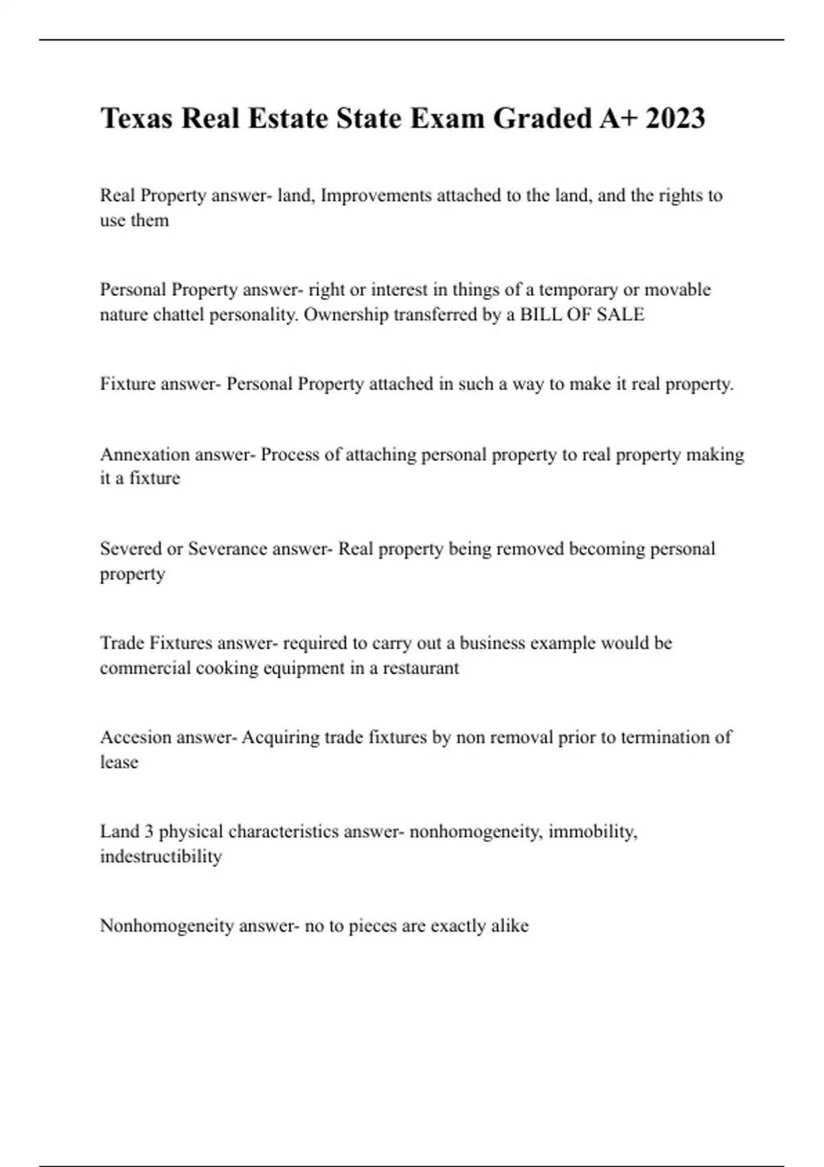 Real Property answer- land, Improvements attached to the land, and the rights to use them Personal Property answer- right or interest in things of a temporary or movable nature chattel personality. Ownership transferred by a BILL OF SALE Fixture answer- Personal Property attached in such a way to make it real property. Annexation answer- Process of attaching personal property to real property making it a fixture Severed or Severance answer- Real property being removed becoming personal property Trade Fixtures answer- required to carry out a business example would be commercial cooking equipment in a restaurant Accesion answer- Acquiring trade fixtures by non removal prior to termination of lease Land 3 physical characteristics answer- nonhomogeneity, immobility, indestructibility Nonhomogeneity answer- no to pieces are exactly alike