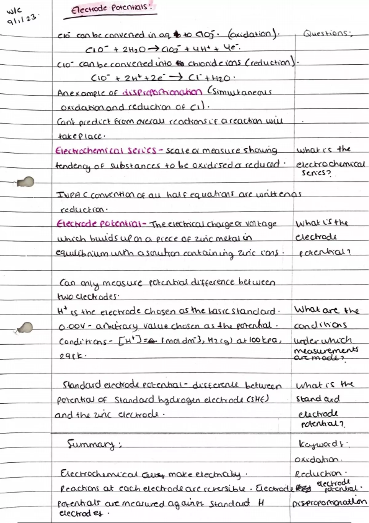 Hand-written Cornell notes on the following topics part of the AQA A-Level specification; electrode potentials, using electrochemical cells, aromatics, thermodynamics, transition metals, polymers, amines and amino acids/proteins/ DNA. Can be used as previews before starting the topic. Written in a question and answer format with a mini summary and key words box at the end. Gives a brief overview of the concepts the topic contains. Offered at the cheapest price possible :)