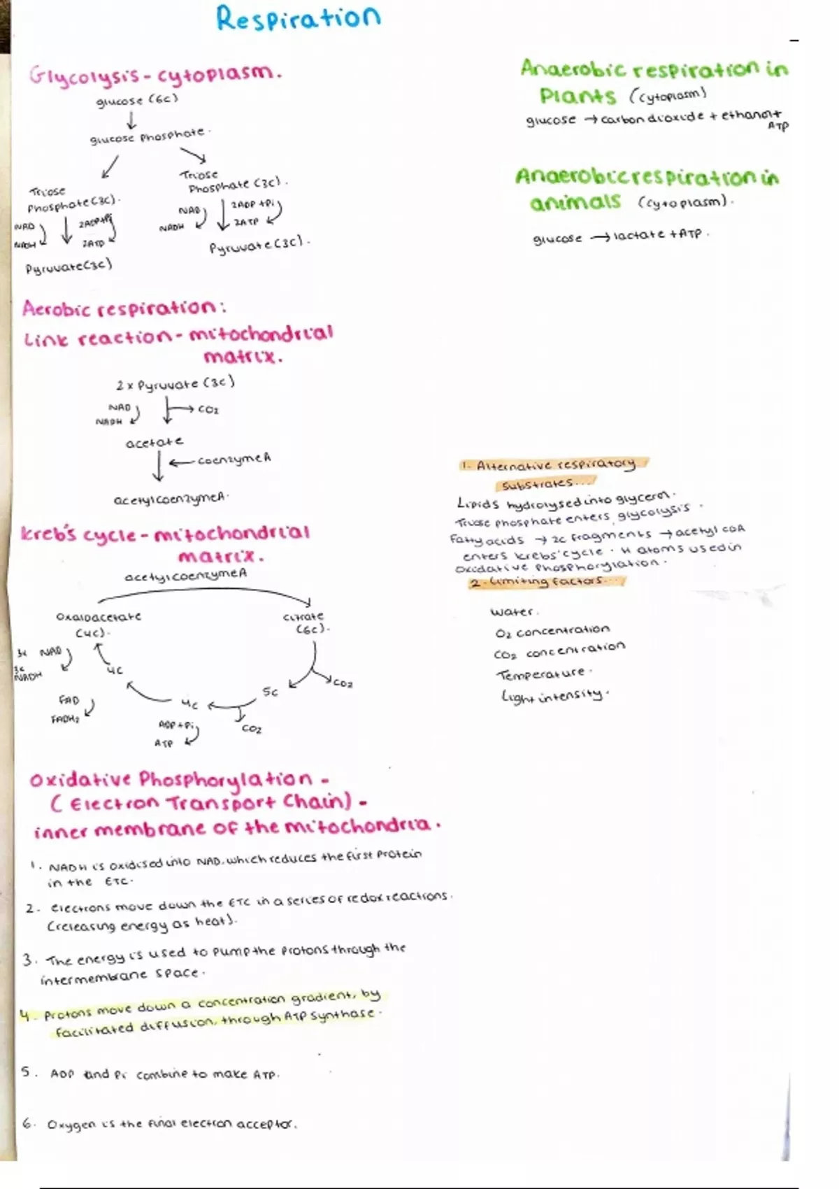 A3 summary on glycolysis, link reaction, Kreb’s cycle and oxidative phosphorylation (electron transport chain).
