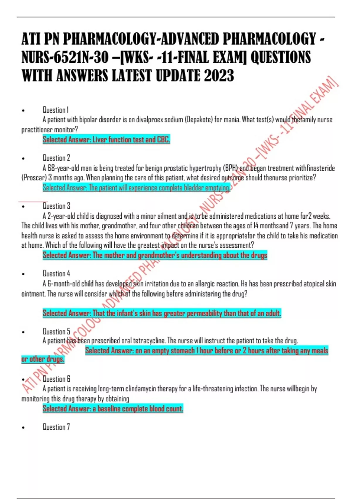 ATI PN PHARMACOLOGY-ADVANCED PHARMACOLOGY - NURS-6521N-30 –[WKS- -11-FINAL EXAM] QUESTIONS WITH ANSWERS LATEST UPDATE 2023 • Question 1 A patient with bipolar disorder is on divalproex sodium (Depakote) for mania. What test(s) would thefamily nurse practitioner monitor? Selected Answer: Liver function test and CBC. • Question 2 A 68-year-old man is being treated for benign prostatic hypertrophy (BPH) and began treatment withfinasteride (Proscar) 3 months ago. When planning the care of this patient, what desired outcome should thenurse prioritize? Selected Answer: The patient will experience complete bladder emptying. • Question 3 A 2-year-old child is diagnosed with a minor ailment and is to be administered medications at home for2 weeks. The child lives with his mother, grandmother, and four other children between the ages of 14 monthsand 7 years. The home health nurse is asked to assess the home environment to determine if it is appropriatefor the child to take his medication at home. Which of the following will have the greatest impact on the nurse's assessment? Selected Answer: The mother and grandmother's understanding about the drugs • Question 4 A 6-month-old child has developed skin irritation due to an allergic reaction. He has been prescribed atopical skin ointment. The nurse will consider which of the following before administering the drug? Selected Answer: That the infant's skin has greater permeability than that of an adult. • Question 5 A patient has been prescribed oral tetracycline. The nurse will instruct the patient to take the drug. Selected Answer: on an empty stomach 1 hour before or 2 hours after taking any meals or other drugs. • Question 6 A patient is receiving long-term clindamycin therapy for a life-threatening infection. The nurse willbegin by monitoring this drug therapy by obtaining Selected Answer: a baseline complete blood count. • Question 7 A Nurse Practitioner is caring for a 64-year-old female patient who is receiving IV heparin and reportsbleeding from her gums. The nurse checks the patient's laboratory test results and finds that she has a very high aPTT. The nurse anticipates that which of the following drugs may be ordered? Selected Answer: Protamine sulfate