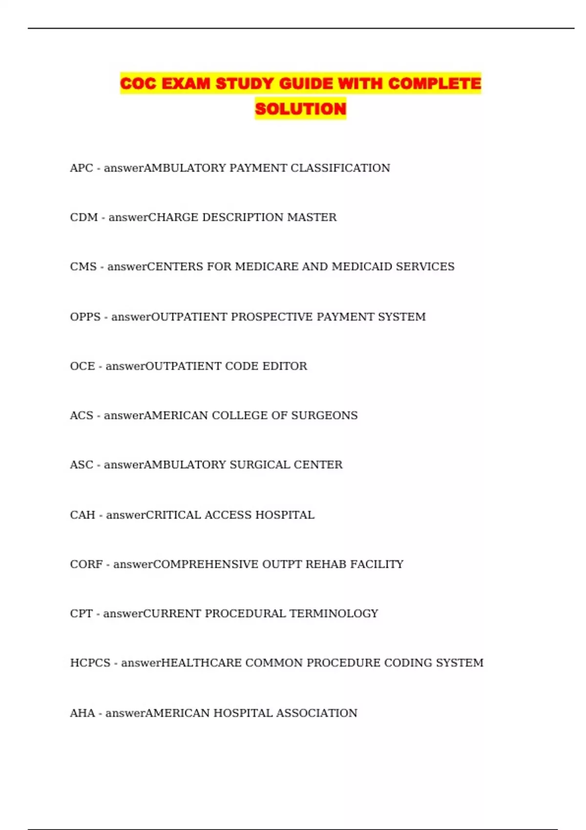 COC EXAM STUDY GUIDE WITH COMPLETE SOLUTION APC - answerAMBULATORY PAYMENT CLASSIFICATION CDM - answerCHARGE DESCRIPTION MASTER CMS - answerCENTERS FOR MEDICARE AND MEDICAID SERVICES OPPS - answerOUTPATIENT PROSPECTIVE PAYMENT SYSTEM OCE - answerOUTPATIENT CODE EDITOR ACS - answerAMERICAN COLLEGE OF SURGEONS ASC - answerAMBULATORY SURGICAL CENTER CAH - answerCRITICAL ACCESS HOSPITAL CORF - answerCOMPREHENSIVE OUTPT REHAB FACILITY CPT - answerCURRENT PROCEDURAL TERMINOLOGY HCPCS - answerHEALTHCARE COMMON PROCEDURE CODING SYSTEM AHA - answerAMERICAN HOSPITAL ASSOCIATION
