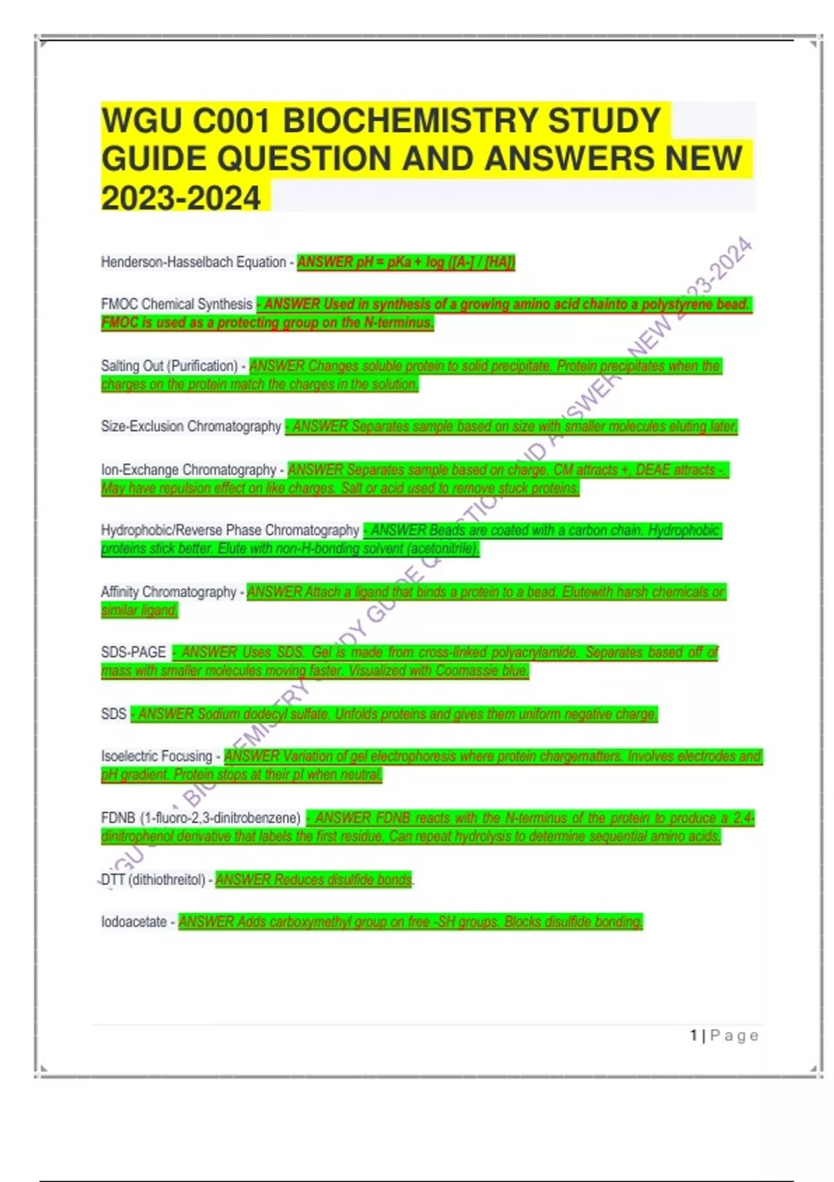 WGU C001 BIOCHEMISTRY STUDY GUIDE QUESTIONS WITH VERIFIED ANSWERS Henderson-Hasselbach Equation - ANSWER pH = pKa + log ([A-] / [HA]) FMOC Chemical Synthesis - ANSWER Used in synthesis of a growing amino acid chainto a polystyrene bead. FMOC is used as a protecting group on the N-terminus. Salting Out (Purification) - ANSWER Changes soluble protein to solid precipitate. Protein precipitates when the charges on the protein match the charges in the solution. Size-Exclusion Chromatography - ANSWER Separates sample based on size with smaller molecules eluting later. Ion-Exchange Chromatography - ANSWER Separates sample based on charge. CM attracts +, DEAE attracts -. May have repulsion effect on like charges. Salt or acid used to remove stuck proteins. Hydrophobic/Reverse Phase Chromatography - ANSWER Beads are coated with a carbon chain. Hydrophobic proteins stick better. Elute with non-H-bonding solvent (acetonitrile). Affinity Chromatography - ANSWER Attach a ligand that binds a protein to a bead. Elutewith harsh chemicals or similar ligand. SDS-PAGE - ANSWER Uses SDS. Gel is made from cross-linked polyacrylamide. Separates based off of mass with smaller molecules moving faster. Visualized with Coomassie blue. SDS - ANSWER Sodium dodecyl sulfate. Unfolds proteins and gives them uniform negative charge. Isoelectric Focusing - ANSWER Variation of gel electrophoresis where protein chargematters. Involves electrodes and pH gradient. Protein stops at their pI when neutral