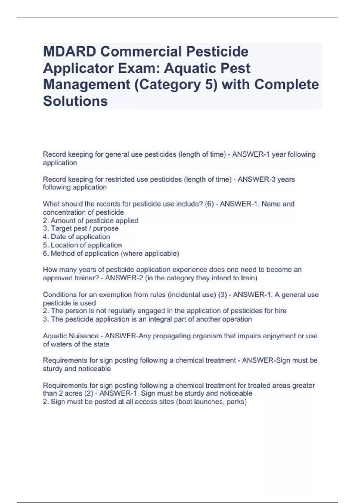 MDARD Commercial Pesticide Applicator Exam: Aquatic Pest Management (Category 5) with Complete SolutionsMDARD Commercial Pesticide Applicator Exam: Aquatic Pest Management (Category 5) with Complete SolutionsMDARD Commercial Pesticide Applicator Exam: Aquatic Pest Management (Category 5) with Complete Solutions Record keeping for general use pesticides (length of time) - ANSWER-1 year following application Record keeping for restricted use pesticides (length of time) - ANSWER-3 years following application What should the records for pesticide use include? (6) - ANSWER-1. Name and concentration of pesticide 2. Amount of pesticide applied 3. Target pest / purpose 4. Date of application 5. Location of application 6. Method of application (where applicable) How many years of pesticide application experience does one need to become an approved trainer? - ANSWER-2 (in the category they intend to train) Conditions for an exemption from rules (incidental use) (3) - ANSWER-1. A general use pesticide is used 2. The person is not regularly engaged in the application of pesticides for hire 3. The pesticide application is an integral part of another operation Aquatic Nuisance - ANSWER-Any propagating organism that impairs enjoyment or use of waters of the state Requirements for sign posting following a chemical treatment - ANSWER-Sign must be sturdy and noticeable Requirements for sign posting following a chemical treatment for treated areas greater than 2 acres (2) - ANSWER-1. Sign must be sturdy and noticeable 2. Sign must be posted at all access sites (boat launches, parks)