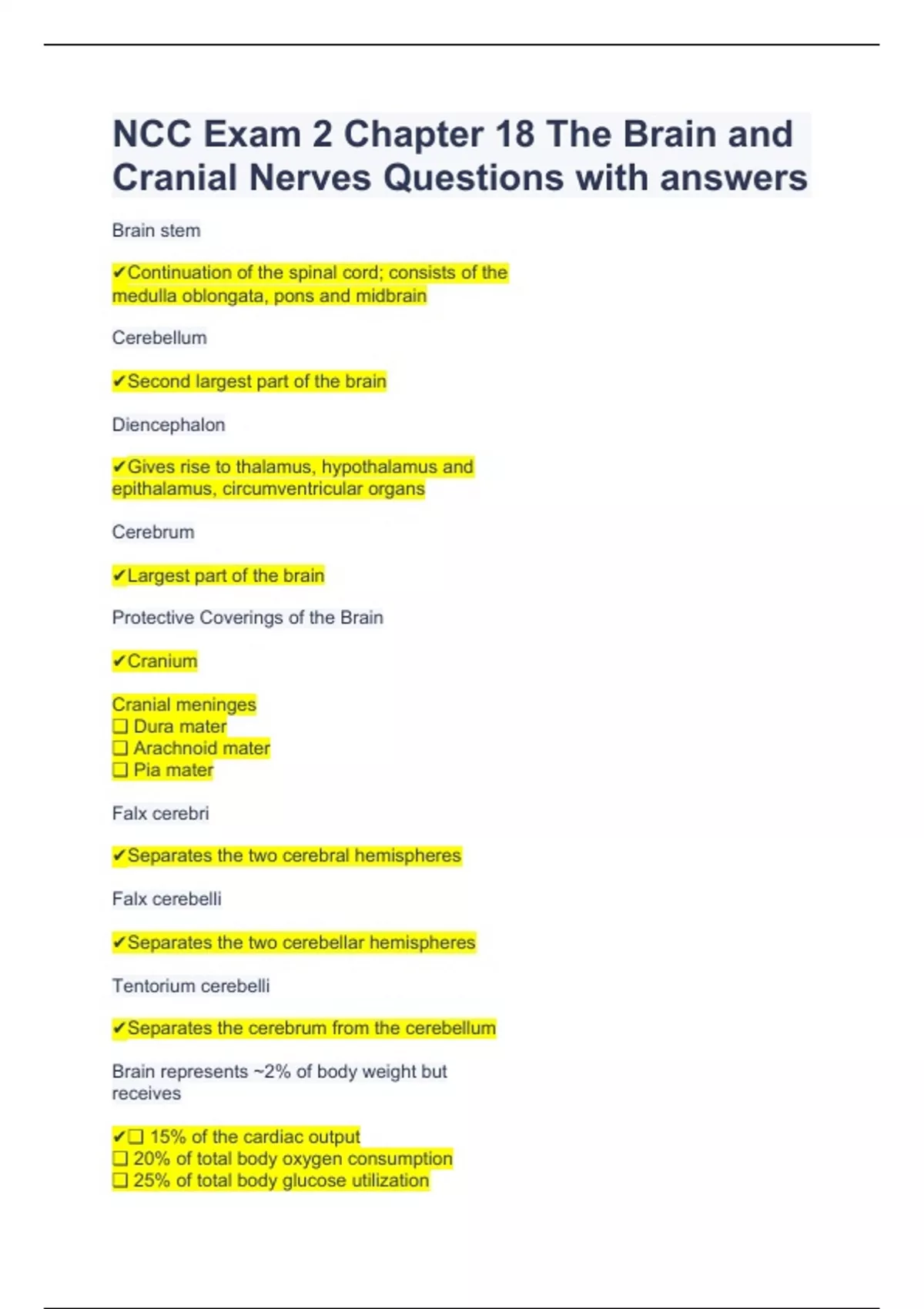 NCC Exam 2 Chapter 18 The Brain and Cranial Nerves Questions with answers