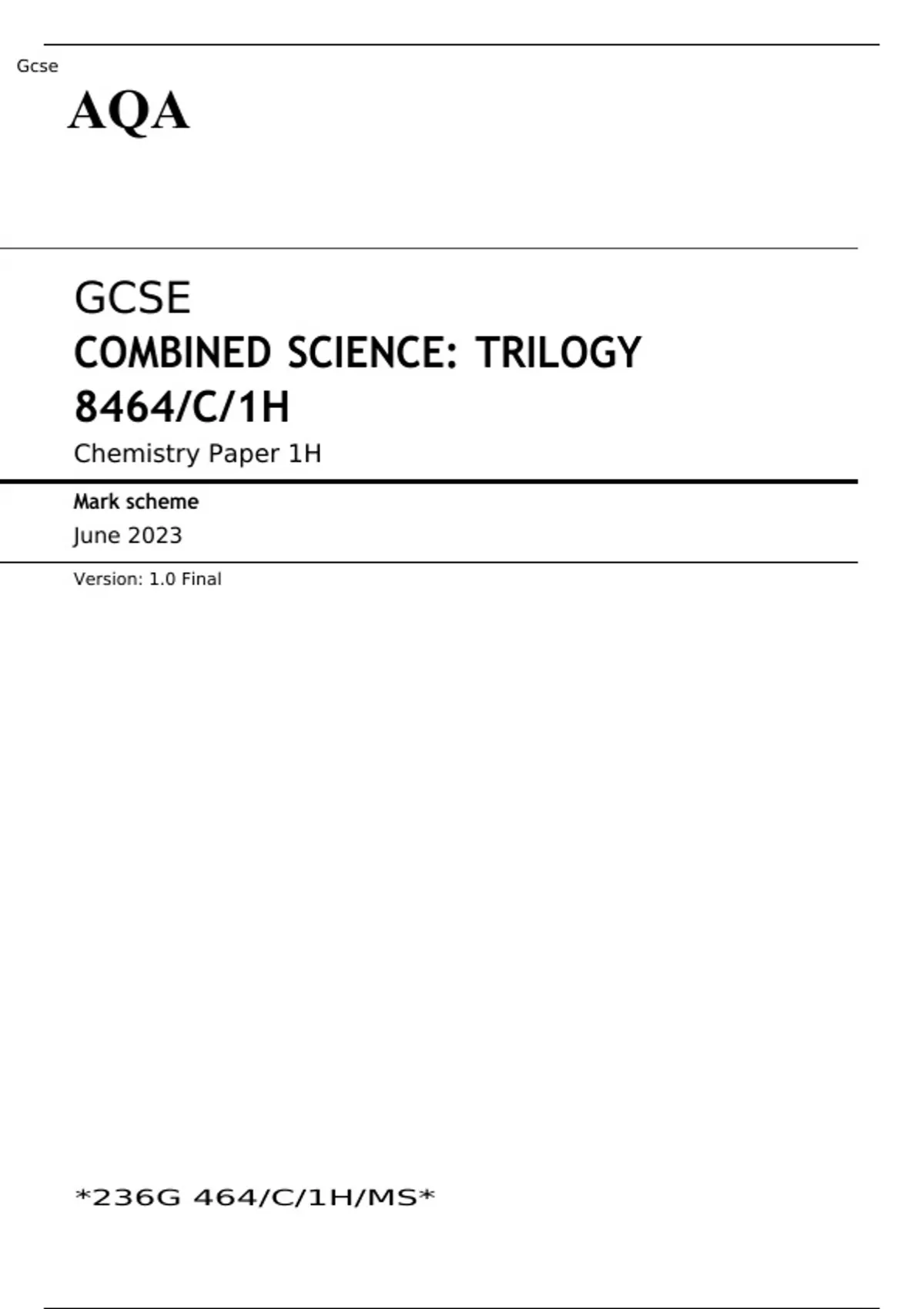 AQA GCSE COMBINED SCIENCE TRILOGY Higher Tier Chemistry Paper 1 JUNE 2023 QUESTION PAPER and MARK SCHEME