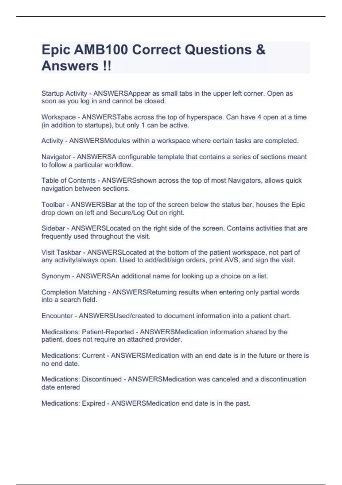 Epic AMB100 Correct Questions & Answers !!
