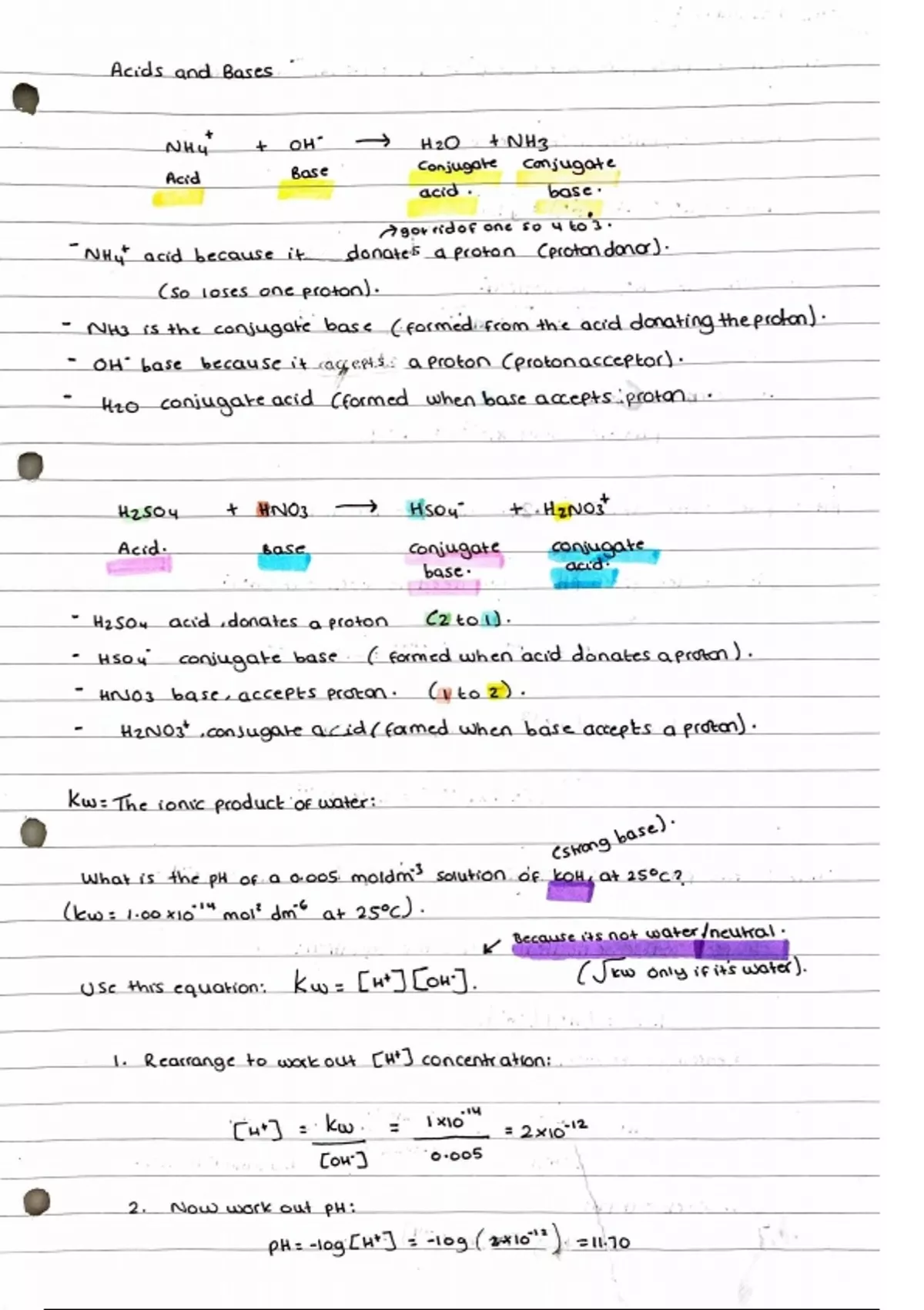Hand-written notes on what acids and bases are, Kw (ionic product of water) and Ka (the acid dissociation constant). Also contains step-by-step worked examples to make the topic easier to understand :)