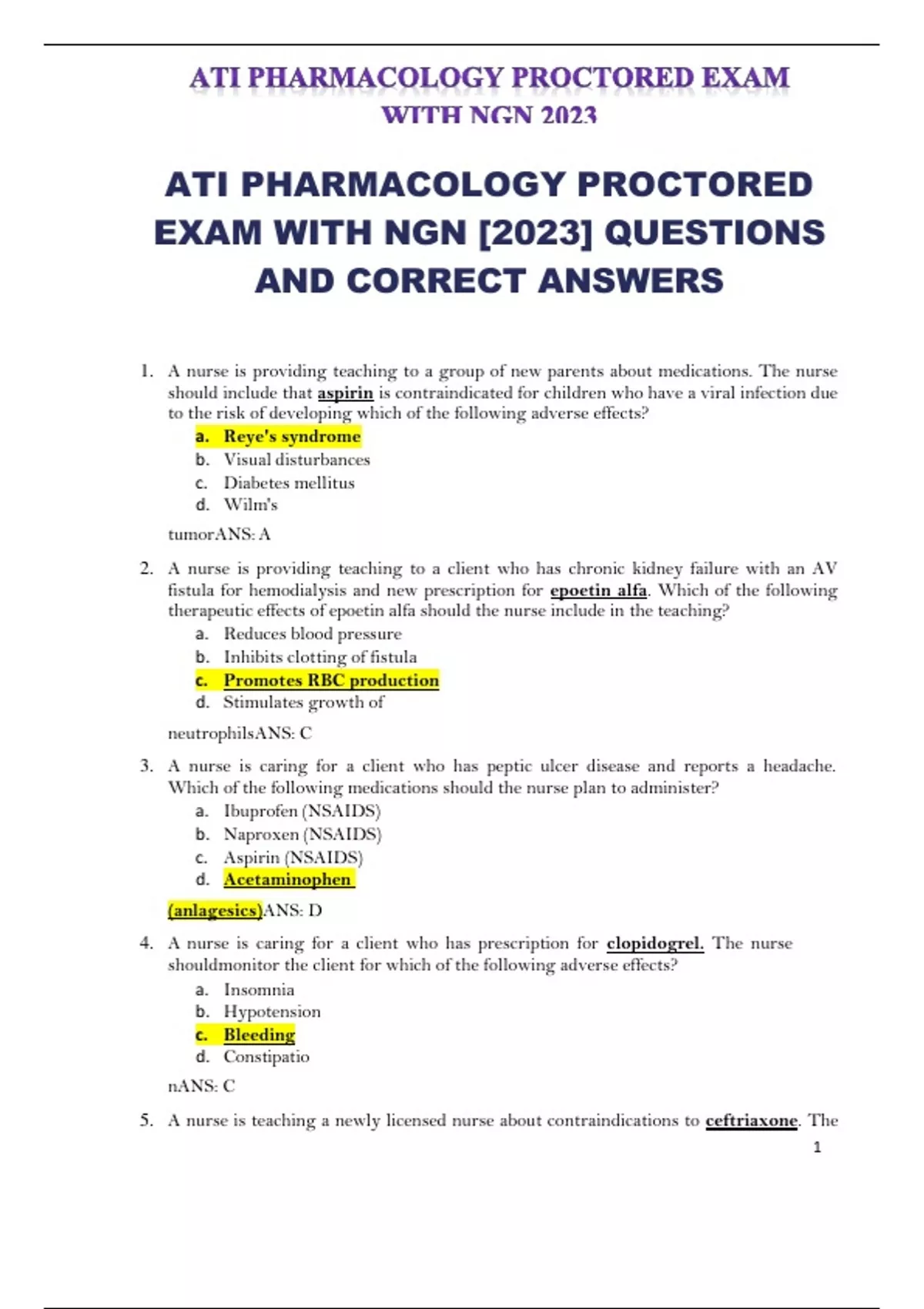 ATI PHARMACOLOGY PROCTORED EXAM WITH NGN [2023] QUESTIONS AND CORRECT ANSWERS 1. A nurse is providing teaching to a group of new parents about medications. The nurse should include that aspirin is contraindicated for children who have a viral infection due to the risk of developing which of the following adverse effects? a. Reye's syndrome b. Visual disturbances c. Diabetes mellitus d. Wilm's tumorANS: A 2. A nurse is providing teaching to a client who has chronic kidney failure with an AV fistula for hemodialysis and new prescription for epoetin alfa. Which of the following therapeutic effects of epoetin alfa should the nurse include in the teaching? a. Reduces blood pressure b. Inhibits clotting of fistula c. Promotes RBC production d. Stimulates growth of neutrophilsANS: C 3. A nurse is caring for a client who has peptic ulcer disease and reports a headache. Which of the following medications should the nurse plan to administer? a. Ibuprofen (NSAIDS) b. Naproxen (NSAIDS) c. Aspirin (NSAIDS) d. Acetaminophen (anlagesics)ANS: D 4. A nurse is caring for a client who has prescription for clopidogrel. The nurse shouldmonitor the client for which of the following adverse effects? a. Insomnia b. Hypotension c. Bleeding d. Constipatio nANS: C 5. A nurse is teaching a newly licensed nurse about contraindications to ceftriaxone. The nurse should include a severe allergy to which of the following medications as contraindication to ceftriaxone? a. Gentamicin b. Clindamycin c. Piperacillin d. Sulfamethoxazole- trimethroprimANS: C 6. A nurse is providing teaching to a newly licensed nurse about metoclopramide. The nurse should include in the teaching that which of the following conditions is a contraindication to this medication? a. Hyperthyroidism b. Intestinal obstruction c. Glaucoma d. Low blood pressureANS: B