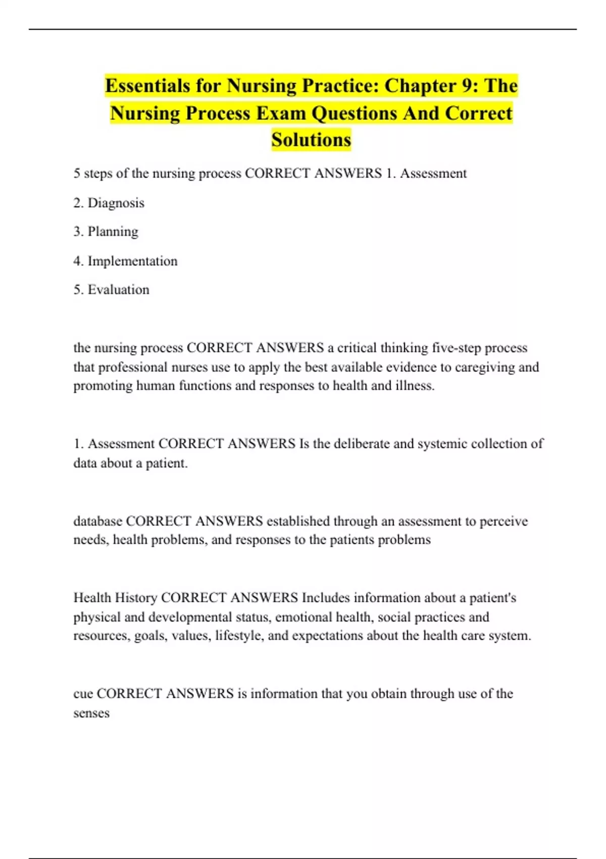 Essentials for Nursing Practice: Chapter 9: The Nursing Process Exam Questions And Correct Solutions