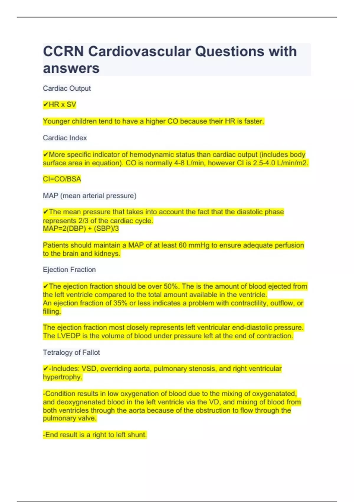 CCRN Cardiovascular Questions with answers