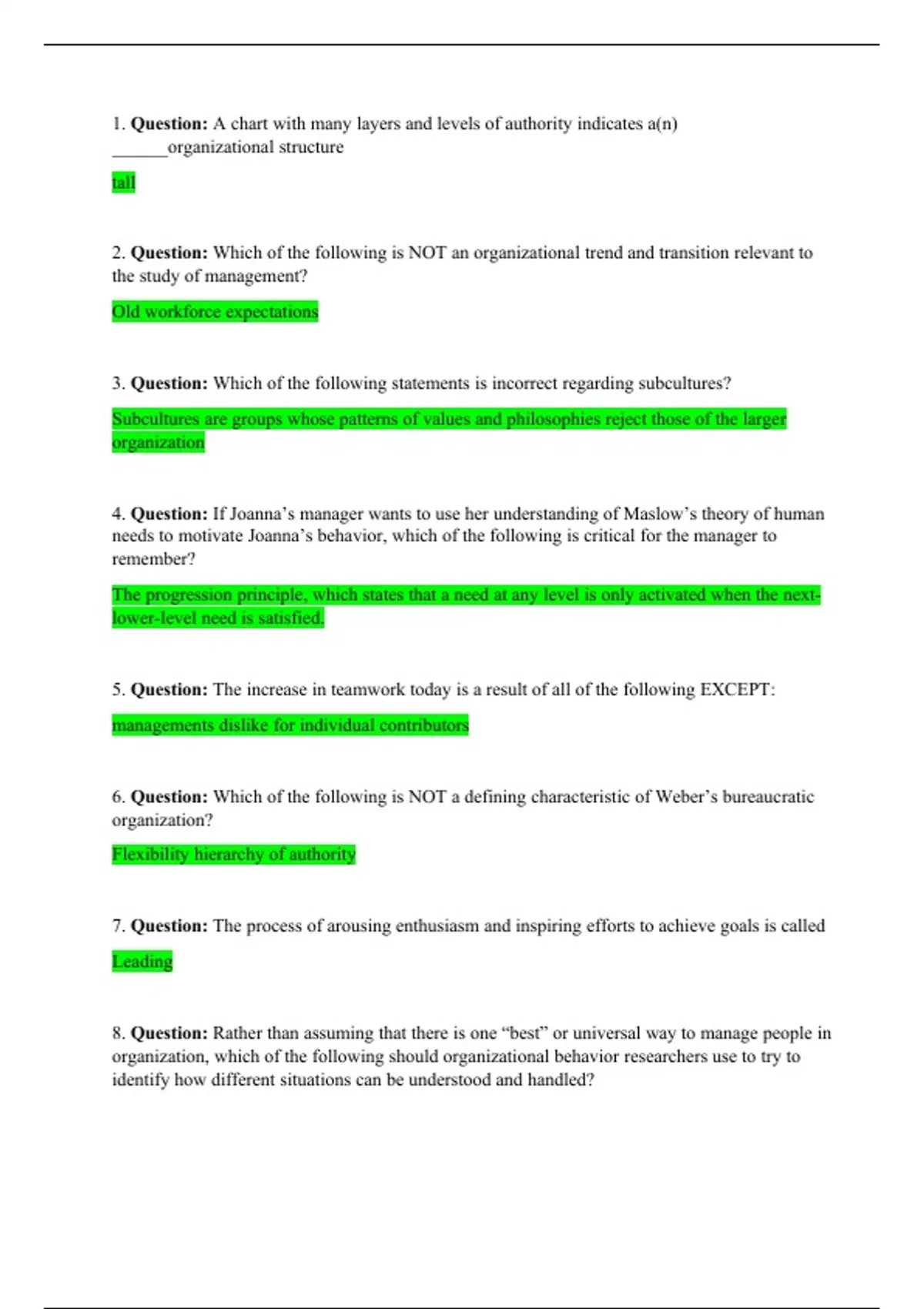 1. Question:A chart with many layers and levels of authority indicates a(n) ______ 2. Question:Which of the following is NOT an organizational trend and transition relevant to the study of management? 3. Question:Which of the following statements is incorrect regarding subcultures? 4. Question:If Joanna’s manager wants to use her understanding of Maslow’s theory of human needs to motivate Joanna’s behavior, which of the following is critical for the manager to remember? 5. Question:The increase in teamwork today is a result of all of the following EXCEPT: 6. Question:Which of the following is NOT a defining characteristic of Weber’s bureaucratic organization? 7. Question:The process of arousing enthusiasm and inspiring efforts to achieve goals is called 8. Question:Rather than assuming that there is one “best” or universal way to manage people in organization, which of the following should organizational behavior researchers use to try to identify how different situations can be understood and handled? 9. Question:Learning organizations are characterized by which of the following core ingredients? 10. Question:Which of the following is NOT an example of a functional manager? 11. Question:Embracing diversity within an organization, rather than simply “meeting quotas” may allow the organization to achieve which benefit? 12. Question:Productivity is _____ of work performance, with resource utilization considered 13. Question:At a typical non-profit organization, the _____ oversees the work of the president 14. Question:Paul is a recording studio manager who needs one of his sound technicians to master a recently recorded album by the end of the workday. What ability will Paul most keep in mind when selecting a technician? 15. Question:The statement, “it can be very efficient, but often at the expense of flexibility,” is an accurate evaluation of which management approach? 16. Question:You are developing a start-up company that plans to offer a new, highly secure financial transaction service, which must be seen as trustworthy and reliable in order to be successful. Which of the following would be a reason for you to set the company up as a bureaucracy? 17. Question:Needs such as security, protection, and stability are examples of ______ needs 18. Question:Two adults in their forties were recently laid off from the factory that they worked at for 15 years. They want to be able to find better jobs and be more successful in their future careers. How can organizational behavior help them? 19. Question:A direct line of authority for conducting the major business of the organization is known as _____ 20. Question:Which of the following statements accurately describes organizational culture?