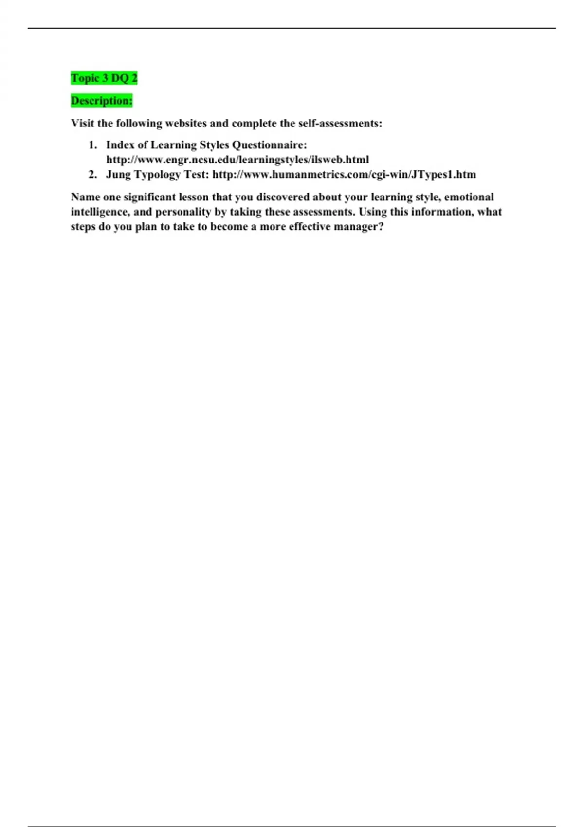 Topic 3 DQ 2 Description: Visit the following websites and complete the self-assessments: 1. Index of Learning Styles Questionnaire: 2. Jung Typology Test: Name one significant lesson that you discovered about your learning style, emotional intelligence, and personality by taking these assessments. Using this information, what steps do you plan to take to become a more effective manager?