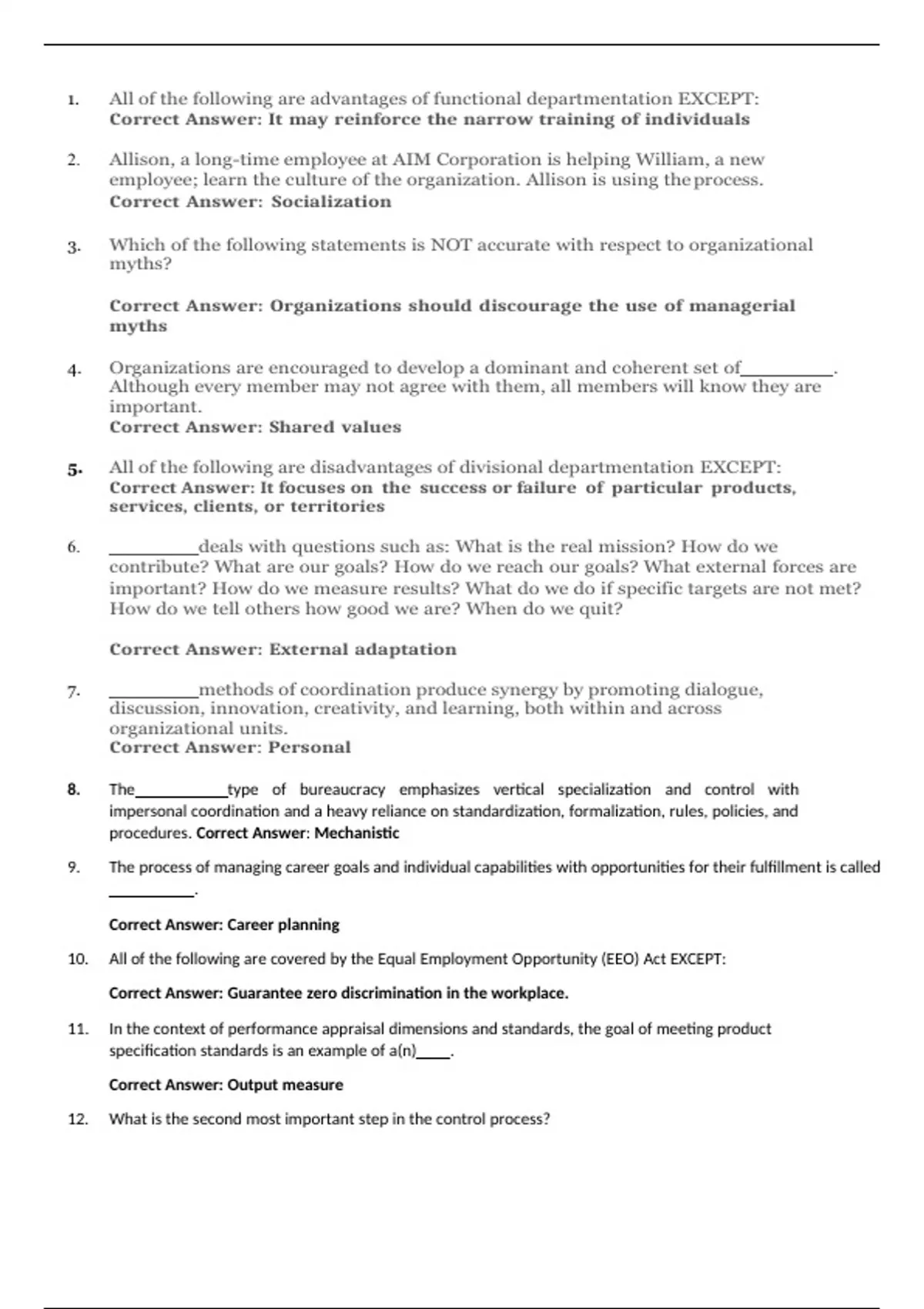 1. Question:AllofthefollowingareadvantagesoffunctionaldepartmentationEXCEPT: 2. Question:Allison,along-timeemployeeatAIMCorporationishelpingWilliam,anewemployee;learnthecultureoftheorganization.Allisonisusingthe process. 3. Question:WhichofthefollowingstatementsisNOTaccuratewithrespecttoorganizationalmyths? 4. Question:Organizationsareencouragedtodevelopadominantandcoherentsetof .Althougheverymembermaynotagreewiththem,allmemberswillknowtheyareimportant. 5. Question:All ofthefollowing are disadvantagesofdivisional departmentationEXCEPT: 6. Question: dealswithquestionssuchas:Whatistherealmission?Howdowecontribute?Whatareourgoals?Howdowereachourgoals?Whatexternalforcesareimportant?Howdowemeasureresults?Whatdowedoifspecifictargetsarenotmet?Howdowetellothershowgoodweare?Whendowequit? 7. Question: methods of coordination produce synergy by promoting dialogue,discussion,innovation,creativity,and learning,bothwithinandacrossorganizationalunits. 8. Question:The typeofbureaucracyemphasizesverticalspecializationandcontrolwithimpersonalcoordinationandaheavyrelianceonstandardization,formalization,rules,policies,andprocedures. 9. Question:Theprocessofmanagingcareergoalsandindividualcapabilitieswithopportunitiesfortheirfulfillmentiscalled . 10. Question:AllofthefollowingarecoveredbytheEqualEmploymentOpportunity(EEO)ActEXCEPT: 11. Question:Inthecontextofperformanceappraisaldimensionsandstandards,thegoalofmeetingproductspecificationstandardsisanexampleofa(n) . 12. Question:Whatisthesecondmostimportantstepinthecontrolprocess? 13. Question:Executives,managers,andsupervisorsarehierarchicallyconnectedthroughthe ,whichisalistingofwhoreportstowhomup and down the firm. 14. Question: ___ areembellishedheroicaccountsofaccomplishments,especiallyregardingthefoundingofanorganization. 15. Question:Jasonworksasasocialworkeratalocalhospital.Heloveshisjobandderivesgreatsatisfactionfromfeelingasthoughhehashelpedothersandmadeadifferenceinthecommunity.Jasonismotivatedby rewards. 16. Question:Inthecontextofthethreeimportantlevelsofculturalanalysisinorganizations,thelevelreferredtoas canplayacriticalpartinlinkingpeopletogetherandcanprovideapowerfulmotivationalmechanismformembersof theculture. 17. Question: ___ rewardsemployeesbasedontheentireorganization’sperformance. 18. Question:Aconfigurationinvolvingoneortwowaysofspecializingindividualsandunitsiscalleda(n): 19. Question:Whichstepintheinnovationprocessfocusesonestablishinganidea’spotentialvalueandapplication? 20. Question:Whichtypeoftechnologyisprovidedbybanksthatlinkcreditorsanddepositorsandstoremoneyandinformationtofacilitatesuch exchanges? 21. Question:Theprocessofmeasuringperformanceandtakingactiontoensuredesiredresultsareapartofthemanagementfunction of 22. Question:Whichoftheserepresentsabenefitthatanorganizationgetsbyusingindependentcontractors? 23. Question: isthesetofmechanismsusedtokeepactionsoroutputswithinpredeterminedlimits. 24. Question: dealswithquestionssuchas:Whatisouruniqueidentity?Howdoweviewtheworld?Whoisamember?Howdoweallocatepower,status,andauthority?Howdowecommunicate?Whatisthebasisforfriendship? 25. Question:Acomprehensiveapproachtoperformanceappraisalthatusestheevaluationsofbosses,peers,andsubordinatesaswellasself-ratings,customerratings,andratingsofothersoutsidethework unitisknownasa(n) . 26. Question:Whichofthefollowingstatements inaccuratelydescribeenvironmentrichness? 27. Question:Whichoftheseiscalledaprocesswhencompaniestrytoattractaqualifiedpoolofapplicants? 28. Question: _____ unitsareworkgroupsthatconductthemajorbusinessoftheorganization. 29. Question:Often themanagementphilosophyat thetopistoo . 30. Question:Whichoneofthefollowingstatementsaboutdecentralizationis NOTaccurate? 31. Question:Controlsthatfocusondesiredtargetsandallowmanagerstousetheirownmethodsforreachingdefinedtargetsarecalled controls. 32. Question:Althoughresearchsupportsthelogicandtheoreticalbenefitsofmeritpay,italsoindicatesthat 33. Question:WhichofthefollowingisNOTtrueoflaborunions? 34. Question:Infutureyears,agediscriminationispredictedto . 35. Question:Whichtypeoftechnologyis providedbybanksthatlinkcreditors anddepositors andstoremoneyandinformationtofacilitatesuchexchanges? 36. Question:Two common classifications ofoperations technologythathavereceivedconsiderableattentionare classification and classification. 37. Question:Aresearchanddevelopmentlaboratoryisanexampleofwhichtypeoftechnology? 38. Question:Aperformanceappraisalmethodthatusesalogoftheemployee’seffectiveandineffectivejobbehaviorsiscalleda . 39. Question:Tonyis a manager atToneCorporation. As a manager hecan modifythe of culture,suchasthelanguage,stories,rites,rituals,andsagas. 40. Question:Whichstepintheinnovationprocessfocusesonproducingandmarketinganewproductorservice,oronimplementinga newapproach tooperations? 41. Question:Theowners,suppliers,distributors,governmentagencies,andcompetitorswithwhichanorganizationmustinteracttogrowandsurviveconstituteits environment. 42. Question:WhichofthefollowingisNOToneofthestepsinTaylorCox’sfive-stepprogramfordevelopingthemulticulturalorganization? 43. Question:Whichstatementregardingcomparativemethodsofperformanceappraisalisincorrect? 44. Question:Organizationswith possessabroadlyanddeeplysharedvaluesystemthatcanprovideastrongcorporateidentity,enhancecollectivecommitment,provideastablesocialsystem,andreducetheneedforformaland bureaucratic controls. 45. Question:AccentureandBoozAllenHamiltonoffersuggestionsforattractingandretainingtalentedworkingmothers.Theseinclude allof the followingEXCEPT: Further Q & A 1. Question: ___ deals with questions such as: What is our unique identity? How do we view theworld? Who is a member? How do we allocate power, status, and authority? How do wecommunicate?Whatis the basisfor friendship? 2. Question:Theprocessofmeasuringperformanceandtaking actiontoensuredesiredresultsare apartofthemanagementfunctionofcontrolling. 3. Question:Inthecontextofperformanceappraisaldimensionsandstandards,thegoalofmeetingproductspecificationstandard