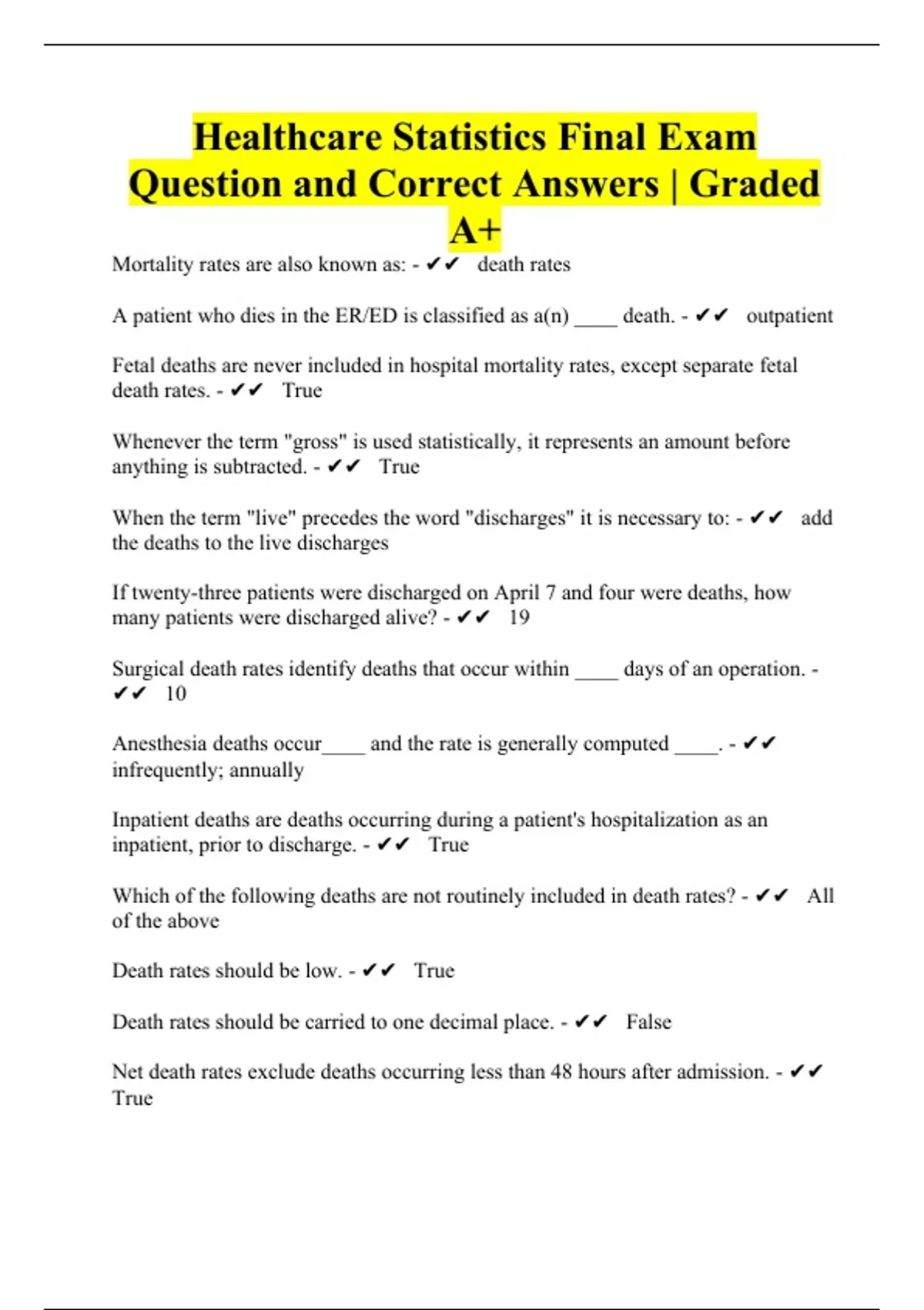 Healthcare Statistics Final Exam Question and Correct Answers | Graded A+