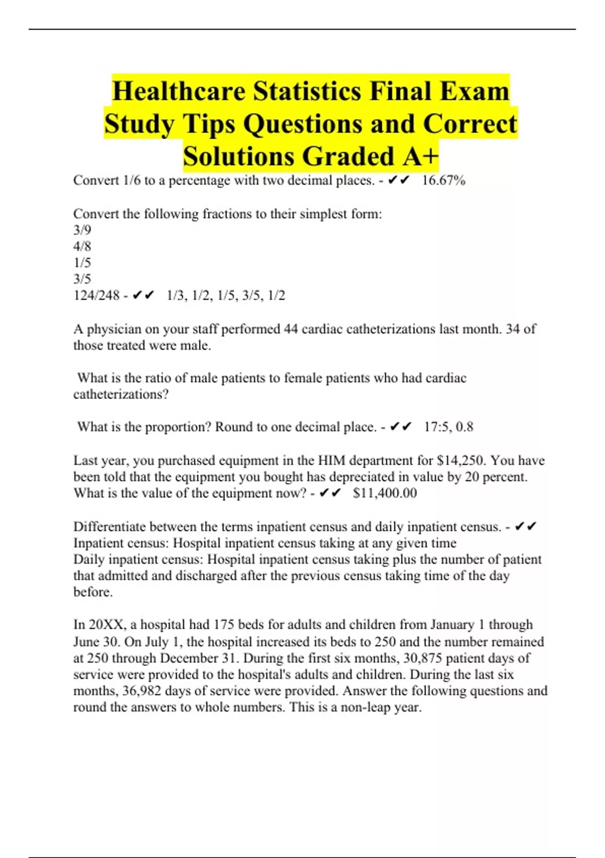 Healthcare Statistics Final Exam Study Tips Questions and Correct Solutions Graded A+