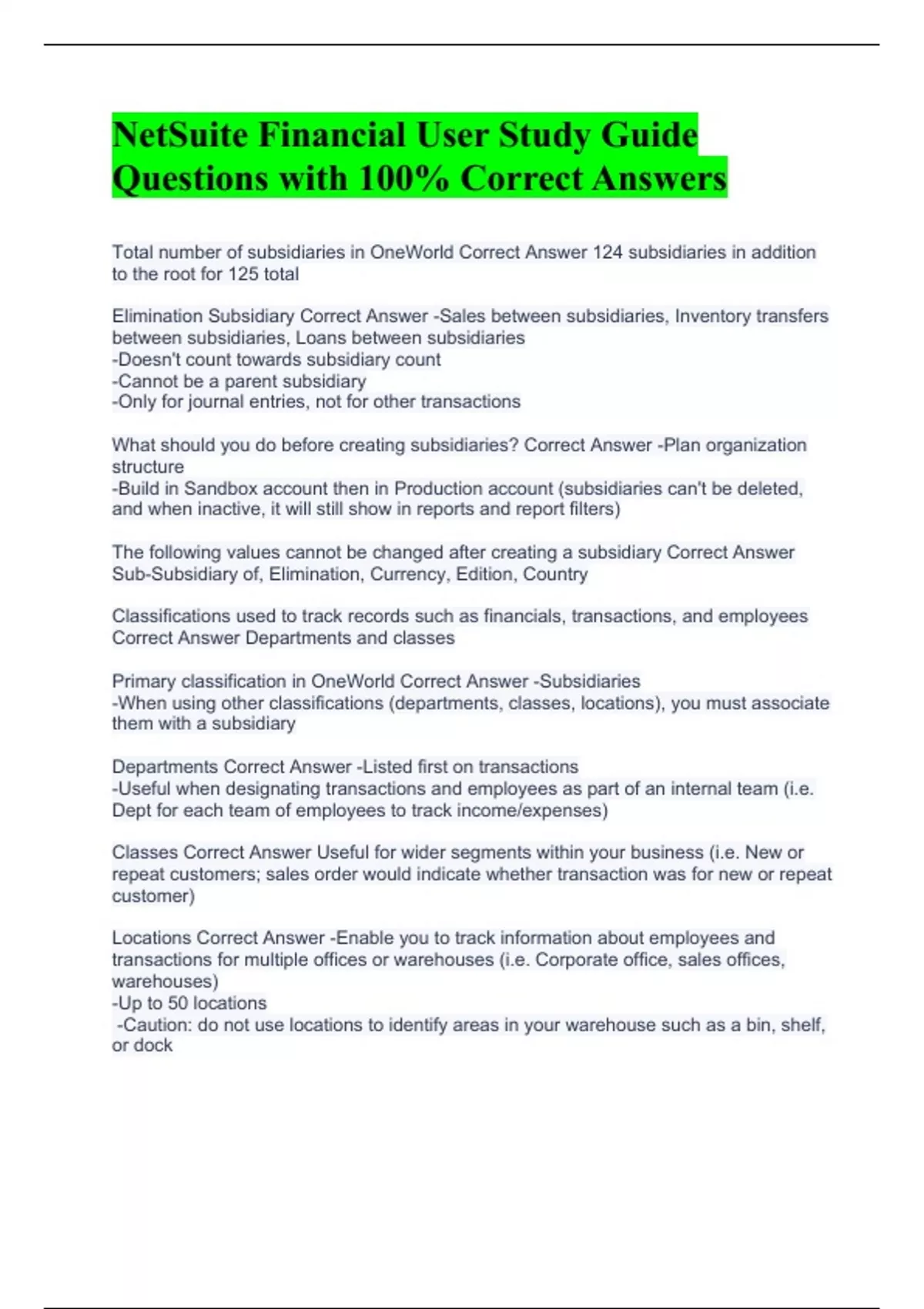 NetSuite Financial User Study Guide Questions with 100% Correct Answers