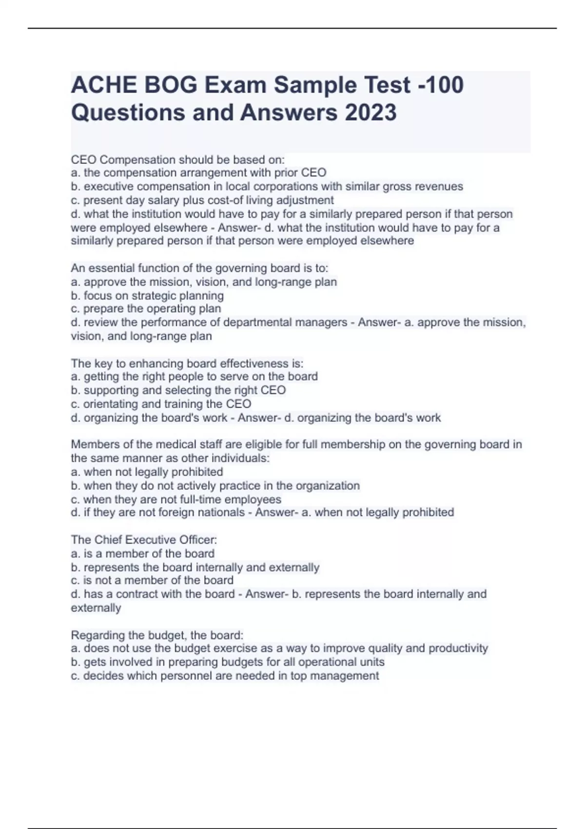 ACHE BOG Exam Sample Test -100 Questions and Answers 2023