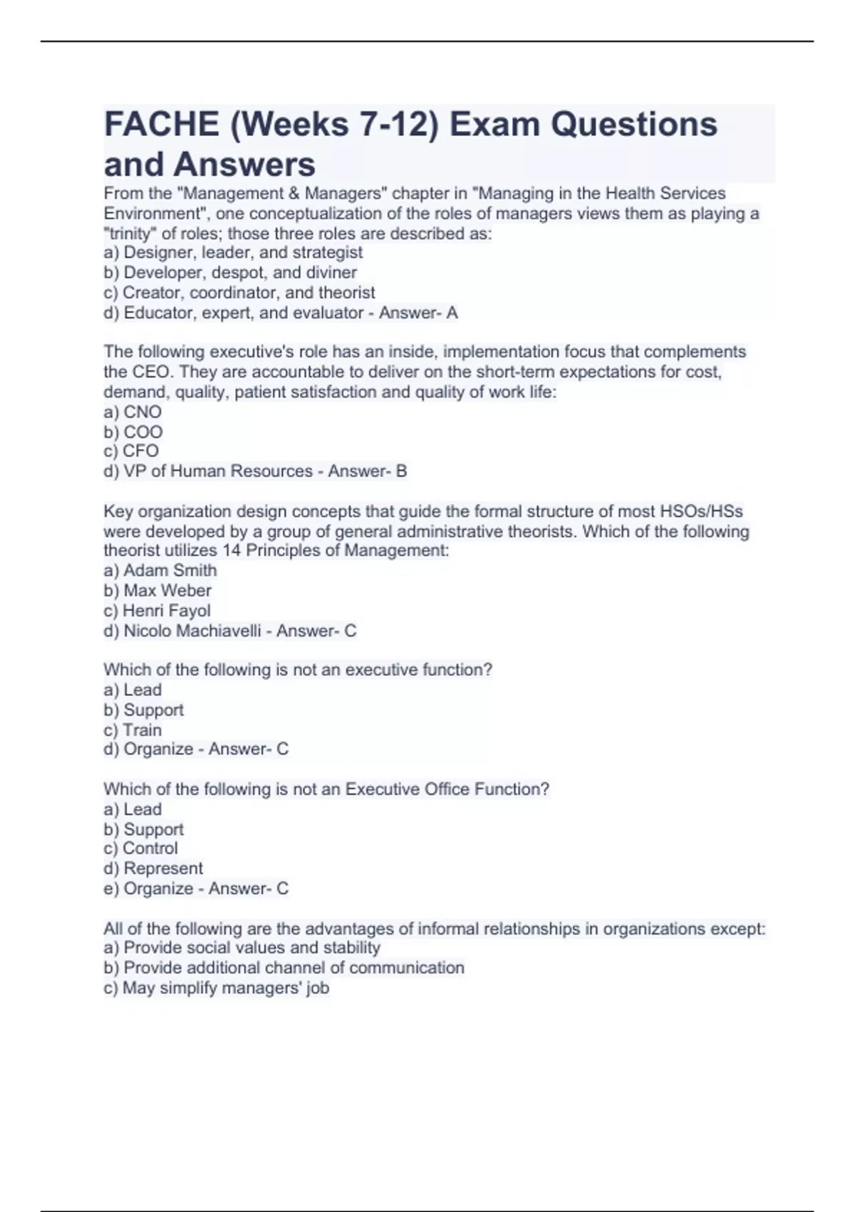 FACHE (Weeks 7-12) Exam Questions and Answers