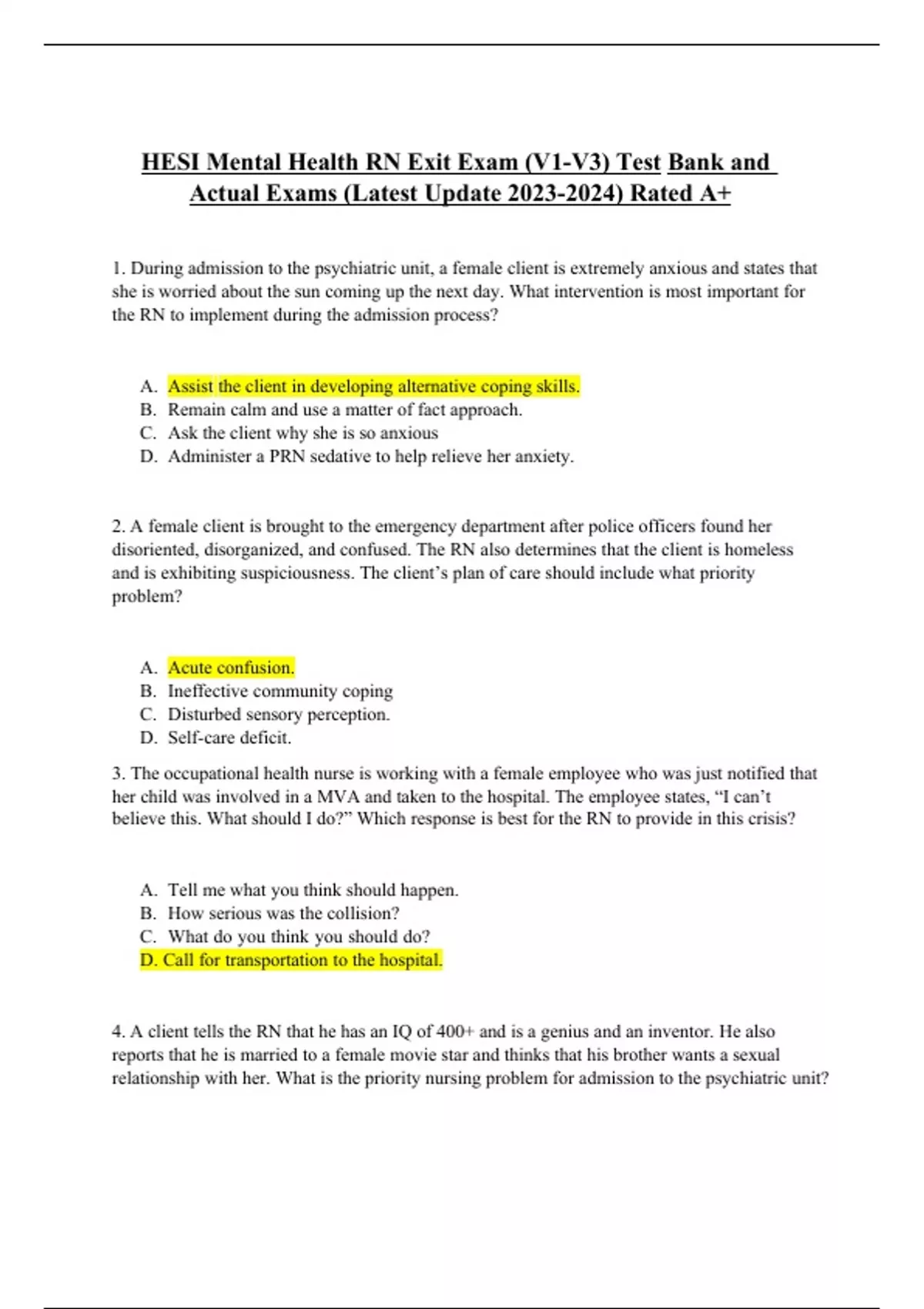 HESI Mental Health RN Exit Exam (V1-V3) Test Bank and Actual Exams (Latest Update ) Rated A+