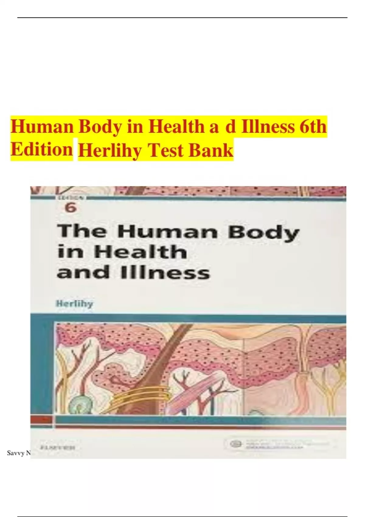 Herlihy: The Human Body in Health and Illness, 6th Edition Test Bank (Chapter 1-27)Chapter 01: Introduction to the Human Body Chapter 02: Basic Chemistry Chapter 03: Cells Chapter 04: Cell Meta bolism Chapter 05: Microbiology Basics Chapter 06: Tissues and Membranes Chapter 07: Integumentary System and Body Temperature Chapter 08: Skeletal System Chapter 09: Muscular System Chapter 10: Nervous System: Nervous Tissue and Brain Chapter 11: Nervous System: Spinal Cord and Peripheral Nerves Chapter 12: Autonomic Nervous System Chapter 13: Sensory System Chapter 14: Endocrine System Chapter 16: Anatomy of the Heart Chapter 17: Function of the Heart Chapter 18: Anatomy of the Blood Vessels and Special Circulations Chapter 19: Functions of the Blood Vessels Chapter 20: Lymphatic System Chapter 21: Immune System Chapter 22: Respiratory System Chapter 23: Digestive System Chapter 24: Urinary System Chapter 25: Water, Electrolyte, and Acid–Base Balance Chapter 26: Reproductive Systems Chapter 27: Human Development and Heredity