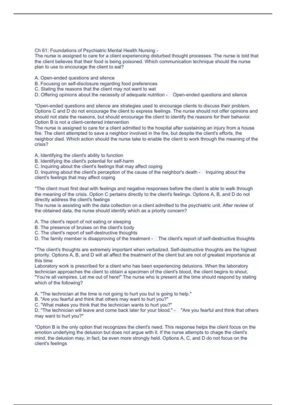 Ch 61: Foundations of Psychiatric Mental Health Nursing - The nurse is assigned to care for a client experiencing disturbed thought processes. The nurse is told that the client believes that their food is being poisoned. Which communication technique should the nurse plan to use to encourage the client to eat? A. Open-ended questions and silence B. Focusing on self-disclosure regarding food preferences C. Stating the reasons that the client may not want to wat D. Offering opinions about the necessity of adequate nutrition - Open-ended questions and silence