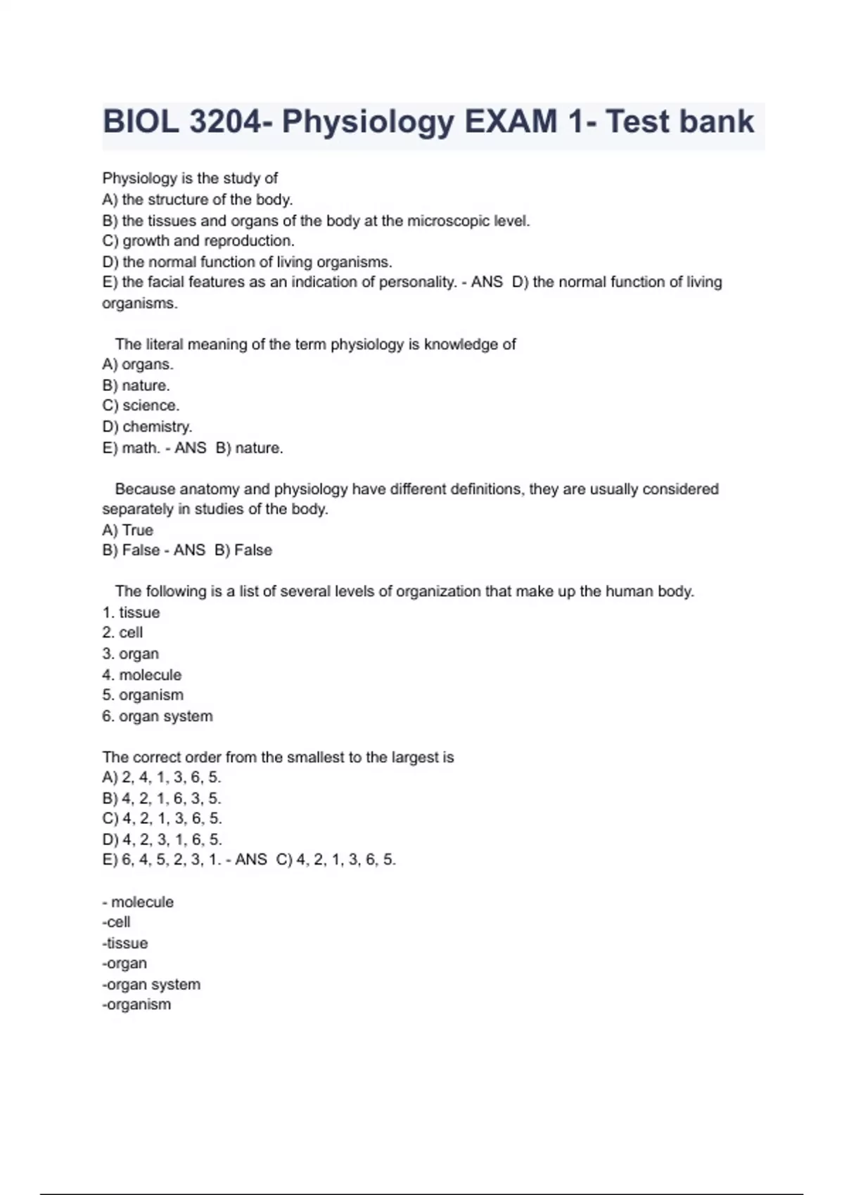 BIOL 3204- Physiology EXAM 1- Test bank Physiology is the study of A) the structure of the body. B) the tissues and organs of the body at the microscopic level. C) growth and reproduction. D) the normal function of living organisms. E) the facial features as an indication of personality. - ANS D) the normal function of living organisms. The literal meaning of the term physiology is knowledge of A) organs. B) nature. C) science. D) chemistry. E) math. - ANS B) nature. Because anatomy and physiology have different definitions, they are usually considered separately in studies of the body. A) True B) False - ANS B) False The following is a list of several levels of organization that make up the human body. 1. tissue 2. cell 3. organ 4. molecule 5. organism 6. organ system The correct order from the smallest to the largest is A) 2, 4, 1, 3, 6, 5. B) 4, 2, 1, 6, 3, 5. C) 4, 2, 1, 3, 6, 5. D) 4, 2, 3, 1, 6, 5. E) 6, 4, 5, 2, 3, 1. - ANS C) 4, 2, 1, 3, 6, 5. - molecule -cell -tissue -organ -organ system -organism "Glucose is transported from blood into cells because cells require glucose to meet their energy needs." This type of explanation is A) mechanistic. B) theological. C) teleological. D) metalogical. E) scatological. - ANS C) teleological. ) "Glucose is transported from blood into cells by transporters in response to insulin." This type of explanation is A) mechanistic. B) theological. C) teleological. D) metalogical. E) scatological. - ANS A) mechanistic Which of the following is a buffer zone between the outside world and most of the cells of the body? A) cell membrane B) red blood cells C) intracellular fluid D) extracellular fluid E) All of the answers are correct. - ANS D) extracellular fluid Which of the following is one of Cannon's "internal secretions"? A) hormones B) nutrients C) water D) inorganic ions E) None of the answers are correct. - ANS A) hormones