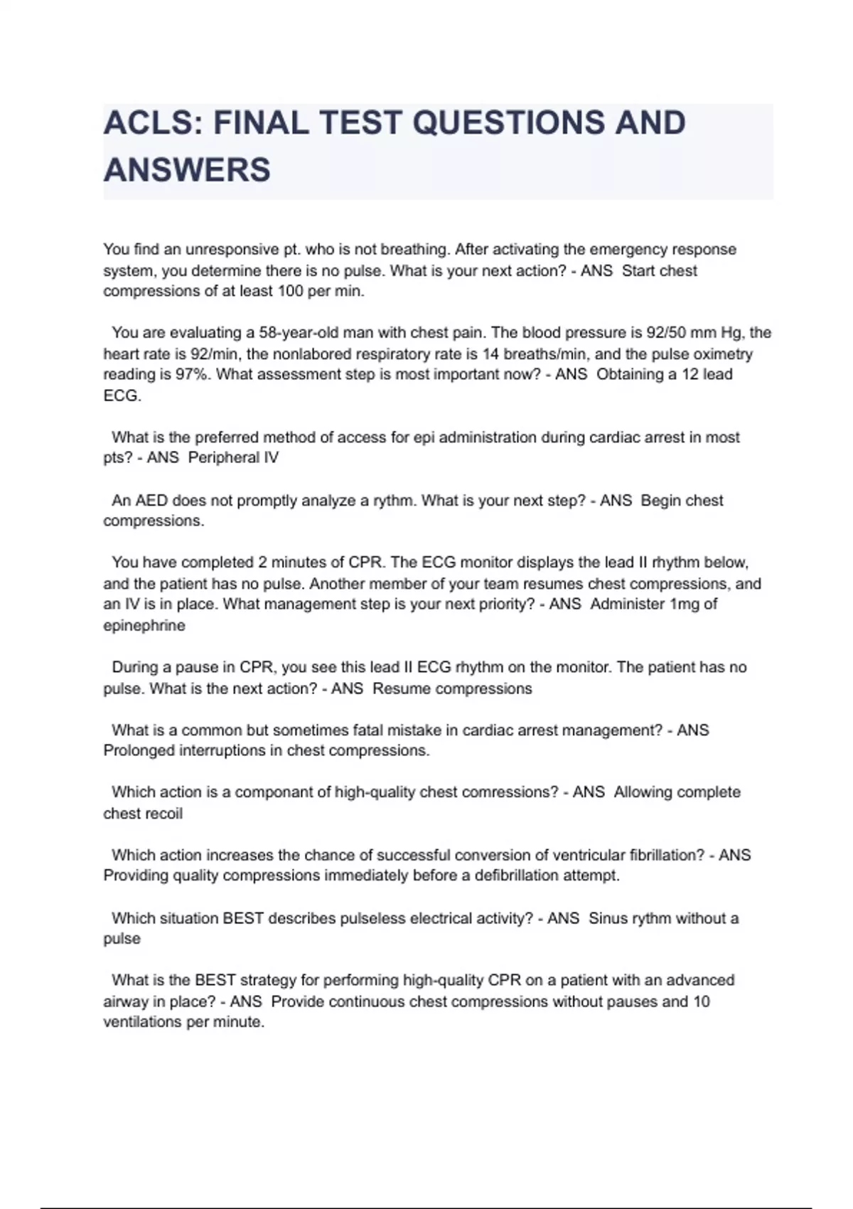 ACLS: FINAL TEST QUESTIONS AND ANSWERS You find an unresponsive pt. who is not breathing. After activating the emergency response system, you determine there is no pulse. What is your next action? - ANS Start chest compressions of at least 100 per min. You are evaluating a 58-year-old man with chest pain. The blood pressure is 92/50 mm Hg, the heart rate is 92/min, the nonlabored respiratory rate is 14 breaths/min, and the pulse oximetry reading is 97%. What assessment step is most important now? - ANS Obtaining a 12 lead ECG. What is the preferred method of access for epi administration during cardiac arrest in most pts? - ANS Peripheral IV An AED does not promptly analyze a rythm. What is your next step? - ANS Begin chest compressions. You have completed 2 minutes of CPR. The ECG monitor displays the lead II rhythm below, and the patient has no pulse. Another member of your team resumes chest compressions, and an IV is in place. What management step is your next priority? - ANS Administer 1mg of epinephrine During a pause in CPR, you see this lead II ECG rhythm on the monitor. The patient has no pulse. What is the next action? - ANS Resume compressions What is a common but sometimes fatal mistake in cardiac arrest management? - ANS Prolonged interruptions in chest compressions. Which action is a componant of high-quality chest comressions? - ANS Allowing complete chest recoil Which action increases the chance of successful conversion of ventricular fibrillation? - ANS Providing quality compressions immediately before a defibrillation attempt. Which situation BEST describes pulseless electrical activity? - ANS Sinus rythm without a pulse What is the BEST strategy for performing high-quality CPR on a patient with an advanced airway in place? - ANS Provide continuous chest compressions without pauses and 10 ventilations per minute. Three minutes after witnessing a cardiac arrest, one member of your team inserts an endotracheal tube while another performs continuous chest compressions. During subsequent ventilation, you notice the presence of a waveform on the capnography screen and a PETCO2 level of 8 mm Hg. What is the significance of this finding? - ANS Chest compressions may not be effective. The use of quantitative capnography in intubated patients - ANS allows for monitoring of CPR quality. For the past 25 minutes, an EMS crew has attempted resuscitation of a patient who originally presented in ventricular fibrillation. After the first shock, the ECG screen displayed asystole, which has persisted despite 2 doses of epinephrine, a fluid bolus, and high-quality CPR. What is your next treatment? - ANS Consider terminating resuscitive efforts after consulting medical control. Which is a safe and effective practice within the defibrillation sequence? - ANS Be sure oxygen is not blowing over the patient's chest during the shock. During your assessment, your patient suddenly loses consciousness. After calling for help and determining that the patient is not breathing, you are unsure whether the patient has a pulse. What is your next action? - ANS Begin chest compressions. What is an advantage of using hands-free defibrillation pads instead of defibrillation paddles? - ANS Hands-free pads allow for a more rapid defibrillation. What action is recommended to help minimize interruptions in chest compressions during CPR? - ANS Continue CPR while charging the defibrillator.