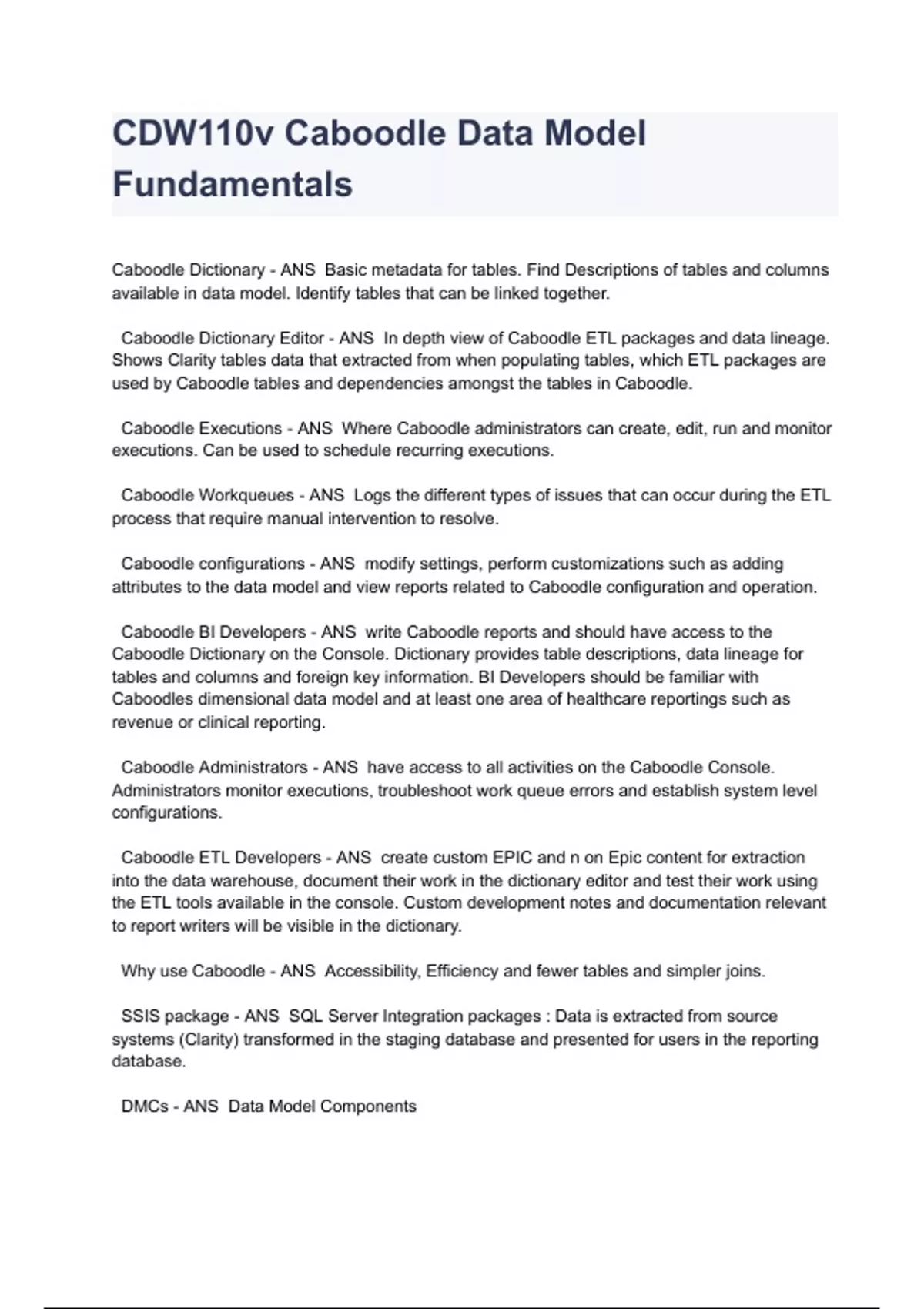 CDW110v Caboodle Data Model Fundamentals Caboodle Dictionary - ANS Basic metadata for tables. Find Descriptions of tables and columns available in data model. Identify tables that can be linked together. Caboodle Dictionary Editor - ANS In depth view of Caboodle ETL packages and data lineage. Shows Clarity tables data that extracted from when populating tables, which ETL packages are used by Caboodle tables and dependencies amongst the tables in Caboodle. Caboodle Executions - ANS Where Caboodle administrators can create, edit, run and monitor executions. Can be used to schedule recurring executions. Caboodle Workqueues - ANS Logs the different types of issues that can occur during the ETL process that require manual intervention to resolve. Caboodle configurations - ANS modify settings, perform customizations such as adding attributes to the data model and view reports related to Caboodle configuration and operation. Caboodle BI Developers - ANS write Caboodle reports and should have access to the Caboodle Dictionary on the Console. Dictionary provides table descriptions, data lineage for tables and columns and foreign key information. BI Developers should be familiar with Caboodles dimensional data model and at least one area of healthcare reportings such as revenue or clinical reporting. Caboodle Administrators - ANS have access to all activities on the Caboodle Console. Administrators monitor executions, troubleshoot work queue errors and establish system level configurations. Caboodle ETL Developers - ANS create custom EPIC and n on Epic content for extraction into the data warehouse, document their work in the dictionary editor and test their work using the ETL tools available in the console. Custom development notes and documentation relevant to report writers will be visible in the dictionary. Why use Caboodle - ANS Accessibility, Efficiency and fewer tables and simpler joins. SSIS package - ANS SQL Server Integration packages : Data is extracted from source systems (Clarity) transformed in the staging database and presented for users in the reporting database. DMCs - ANS Data Model Components Data Model Compenents - ANS collection of metadata tables that support the ETL process and reporting views stored in the FullAccess schema.