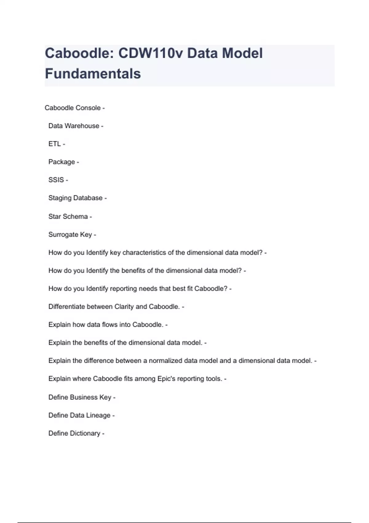 Caboodle: CDW110v Data Model Fundamentals Caboodle Console - Data Warehouse - ETL - Package - SSIS - Staging Database - Star Schema - Surrogate Key - How do you Identify key characteristics of the dimensional data model? - How do you Identify the benefits of the dimensional data model? - How do you Identify reporting needs that best fit Caboodle? - Differentiate between Clarity and Caboodle. - Explain how data flows into Caboodle. - Explain the benefits of the dimensional data model. - Explain the difference between a normalized data model and a dimensional data model. - Explain where Caboodle fits among Epic's reporting tools. -
