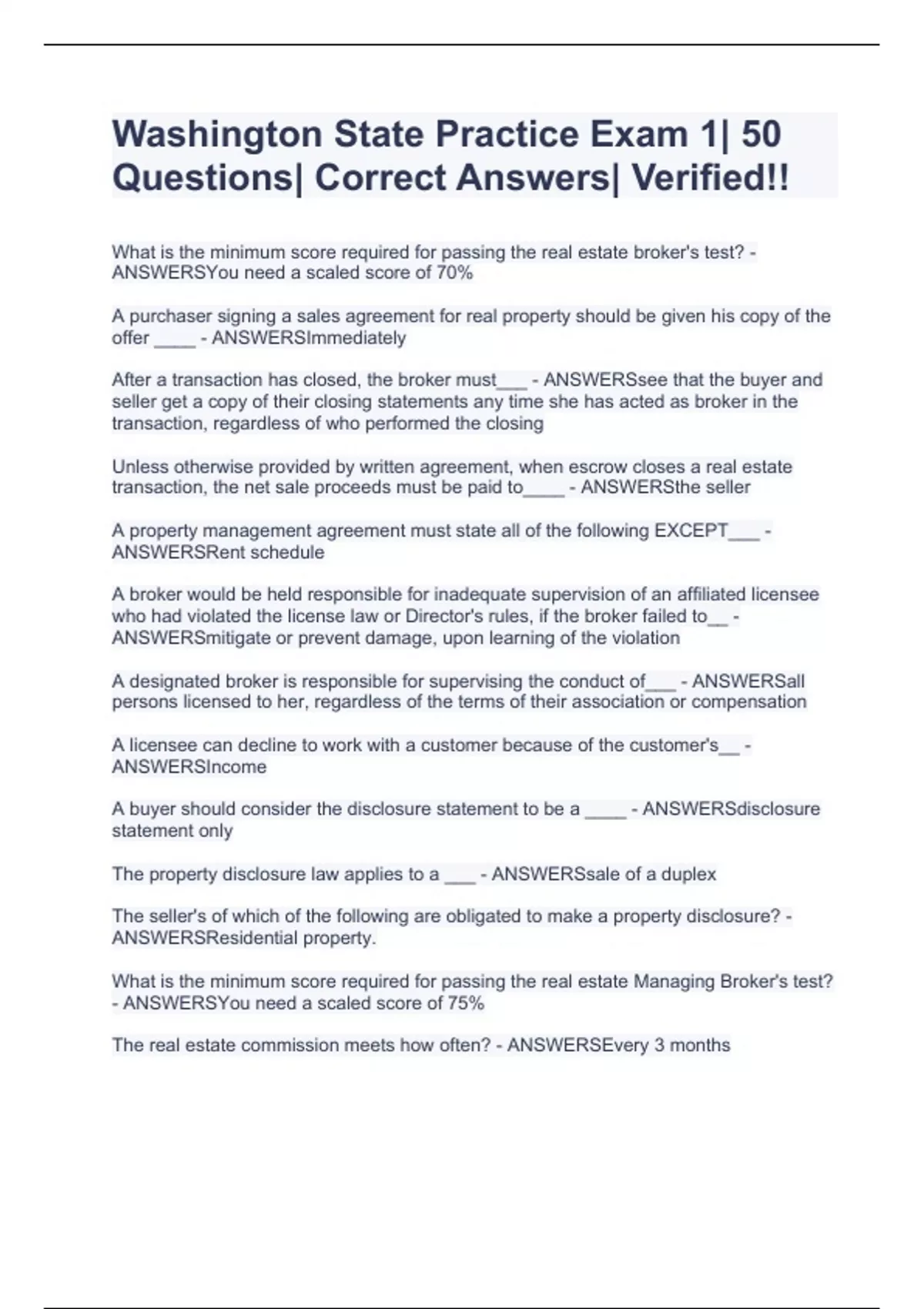 Washington State Practice Exam 1| 50 Questions| Correct Answers| Verified!!