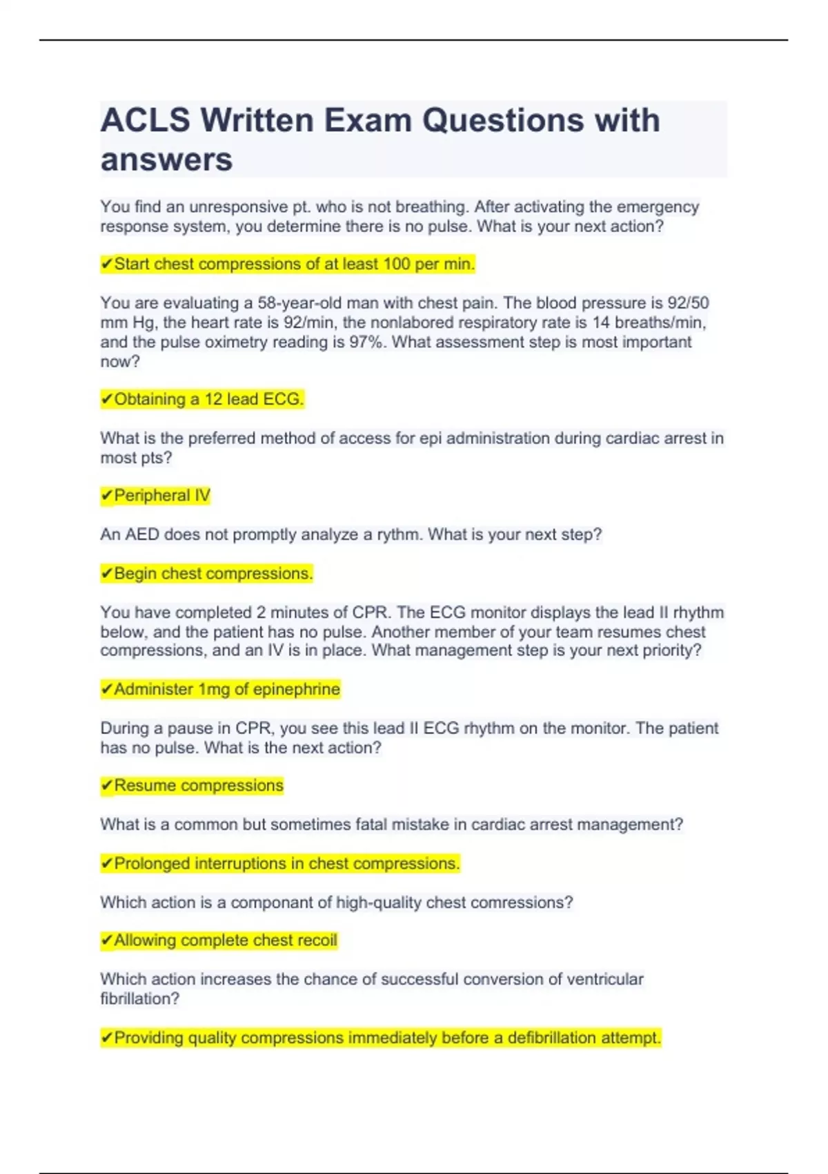 ACLS Written Exam Questions with answer