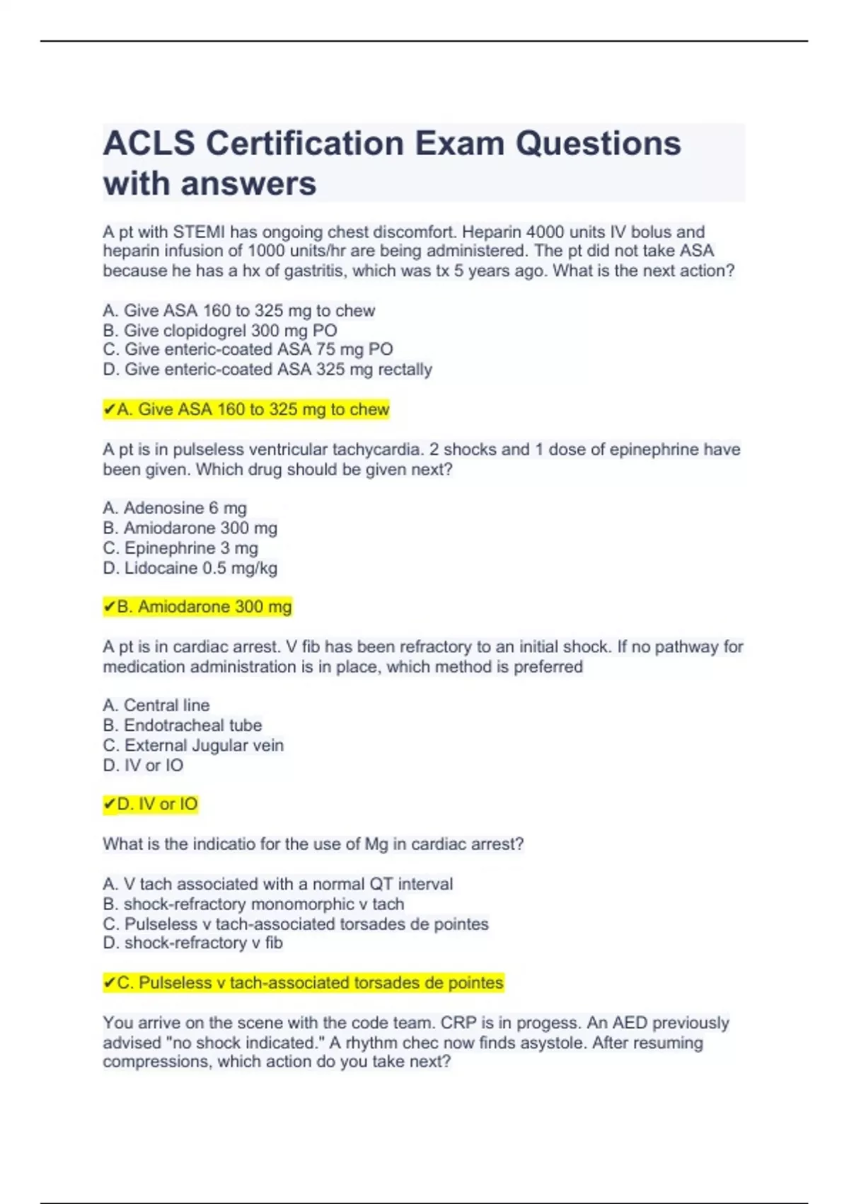 ACLS Certification Exam Questions with answers