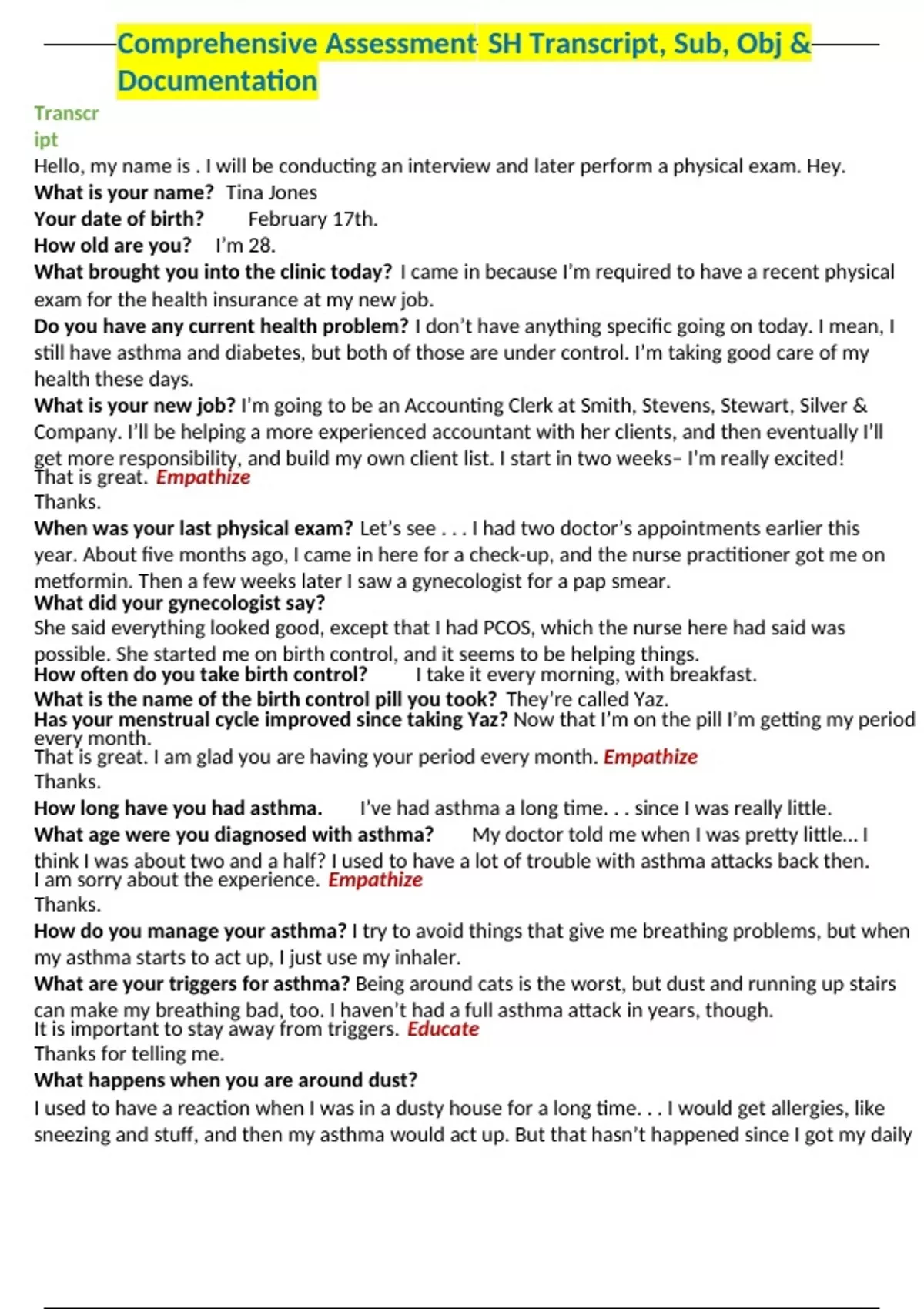 Comprehensive Assessment SH Transcript, Sub, Obj & Documentation