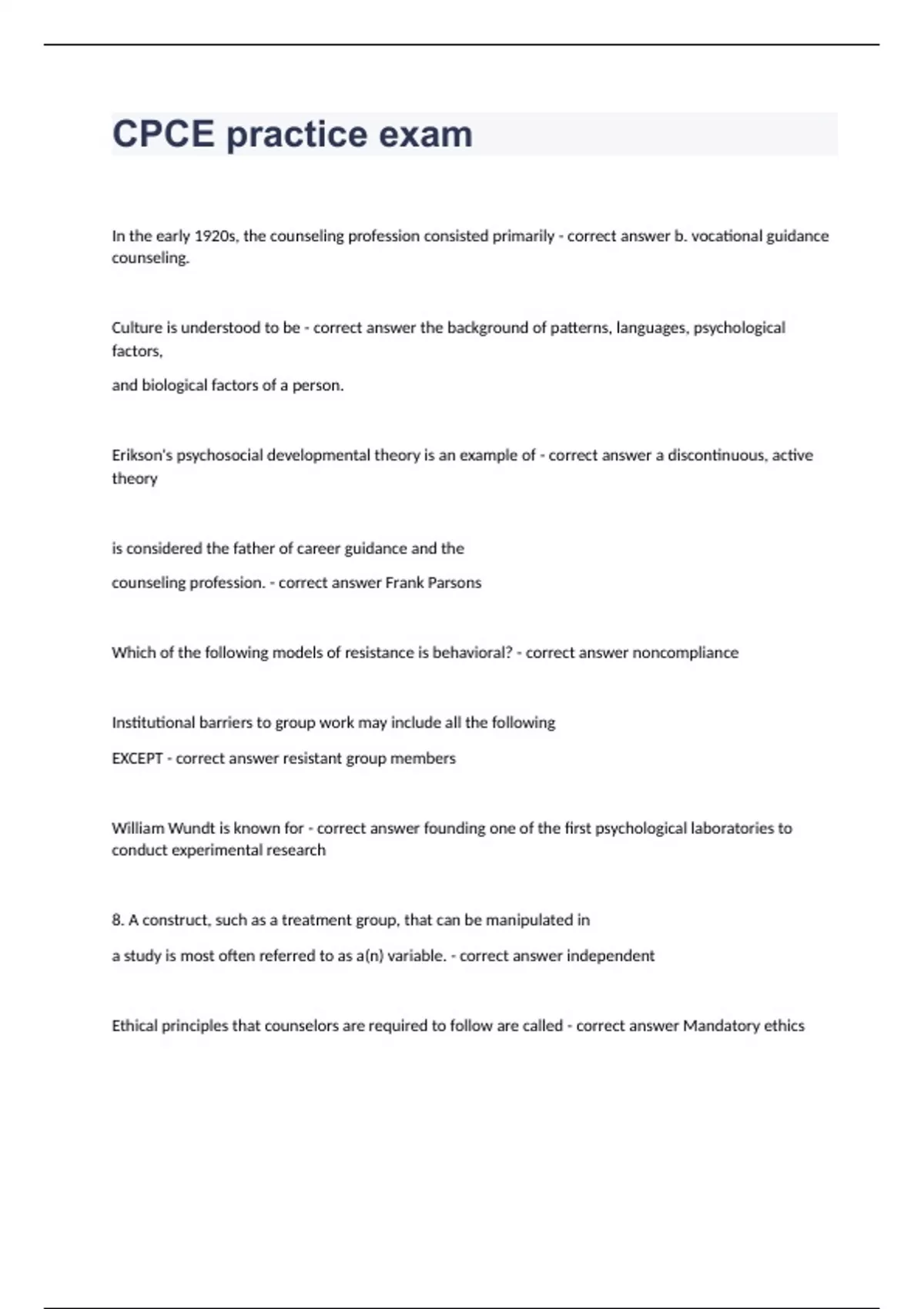 CPCE practice examIn the early 1920s, the counseling profession consisted primarily - correct answer b. vocational guidance counseling. Culture is understood to be - correct answer the background of patterns, languages, psychological factors, and biological factors of a person. Erikson's psychosocial developmental theory is an example of - correct answer a discontinuous, active theory is considered the father of career guidance and the counseling profession. - correct answer Frank Parsons Which of the following models of resistance is behavioral? - correct answer noncompliance Institutional barriers to group work may include all the following EXCEPT - correct answer resistant group members William Wundt is known for - correct answer founding one of the first psychological laboratories to conduct experimental research 8. A construct, such as a treatment group, that can be manipulated in a study is most often referred to as a(n) variable. - correct answer independent Ethical principles that counselors are required to follow are called - correct answer Mandatory ethics The tripartite model of multicultural counseling competencies includes each of the following components EXCEPT - correct answer an etic perspective. For a researcher who has limited time and a low budget, the _____ research design might be most appropriate. - correct answer cross sectional The Fair Labor Standards Act of 1938 was NOT responsible for - correct answer enforcing workplace safety and health standards A professional counselor consults with an experienced colleague about some problems she has encountered while working with a particular client. She is completely reliant on her colleague's expertise to help her move forward with her client. Which consultation model does this represent? - correct answer Triadic-dependent In group work, confidentiality is - correct answer the ethical requirement of group leaders but not group members A(n) does not compare an individual score to a norm group but relies on the judgment of the professional counselor to interpret the data - correct answer non standardized test Whereas 1 million white swans can indicate that all swans are white, one brown swan can falsify it." That is, we can only approximate truth. This description refers to the paradigm. - correct answer post positivism Accreditation is NOT - correct answer involuntary Judging someone's worth by how closely he or she resembles European Americans is termed - correct answer colorism